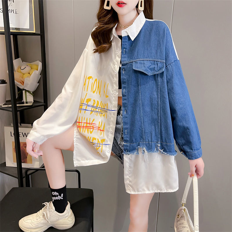 • 韓版設計感牛仔拼接薄款襯衫 新款寬鬆大碼女裝上衣 NT$1080 詳情