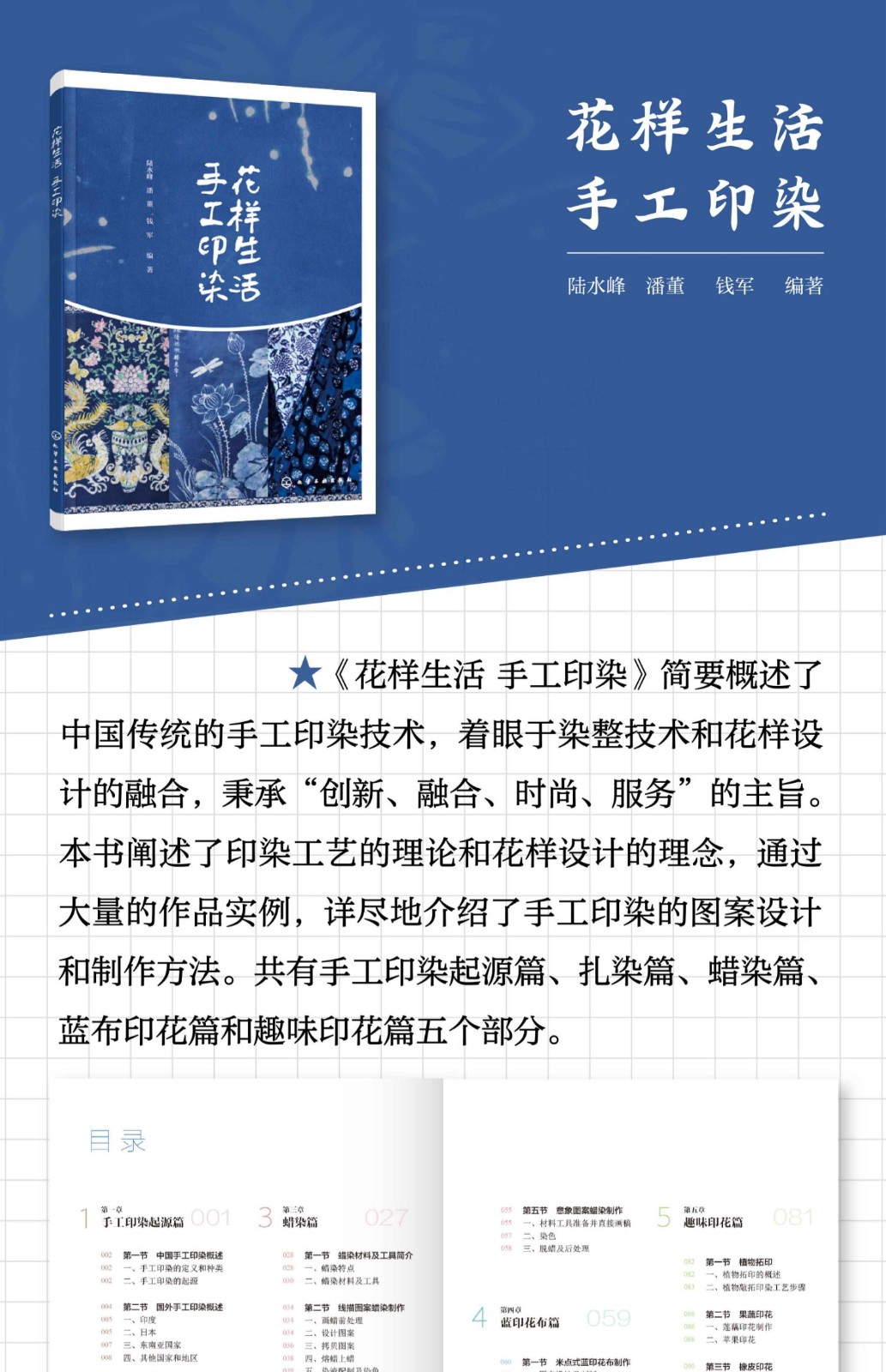 《花樣生活 手工印染》著眼於染整技術和花樣設計的融合,秉承“創新、融合、時尚、服務”的主旨,聯繫生活且QM具體地介紹手工印染的製作工藝、作品實例,對編寫大綱做了合理的設計,其項目主要涵蓋手工印染起源篇、紮染篇、蠟染篇、藍布印花篇和趣味印花篇五個部分。