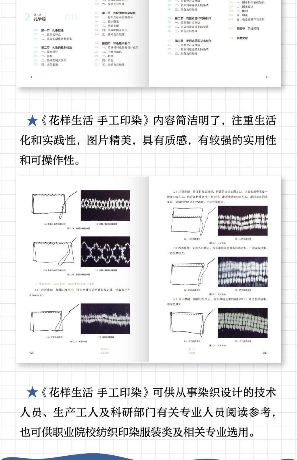 2.詳盡地介紹了手工印染的圖案設計和製作方法。