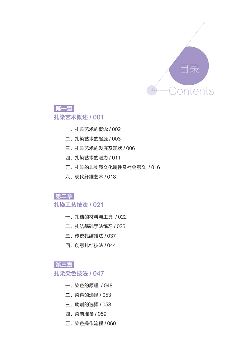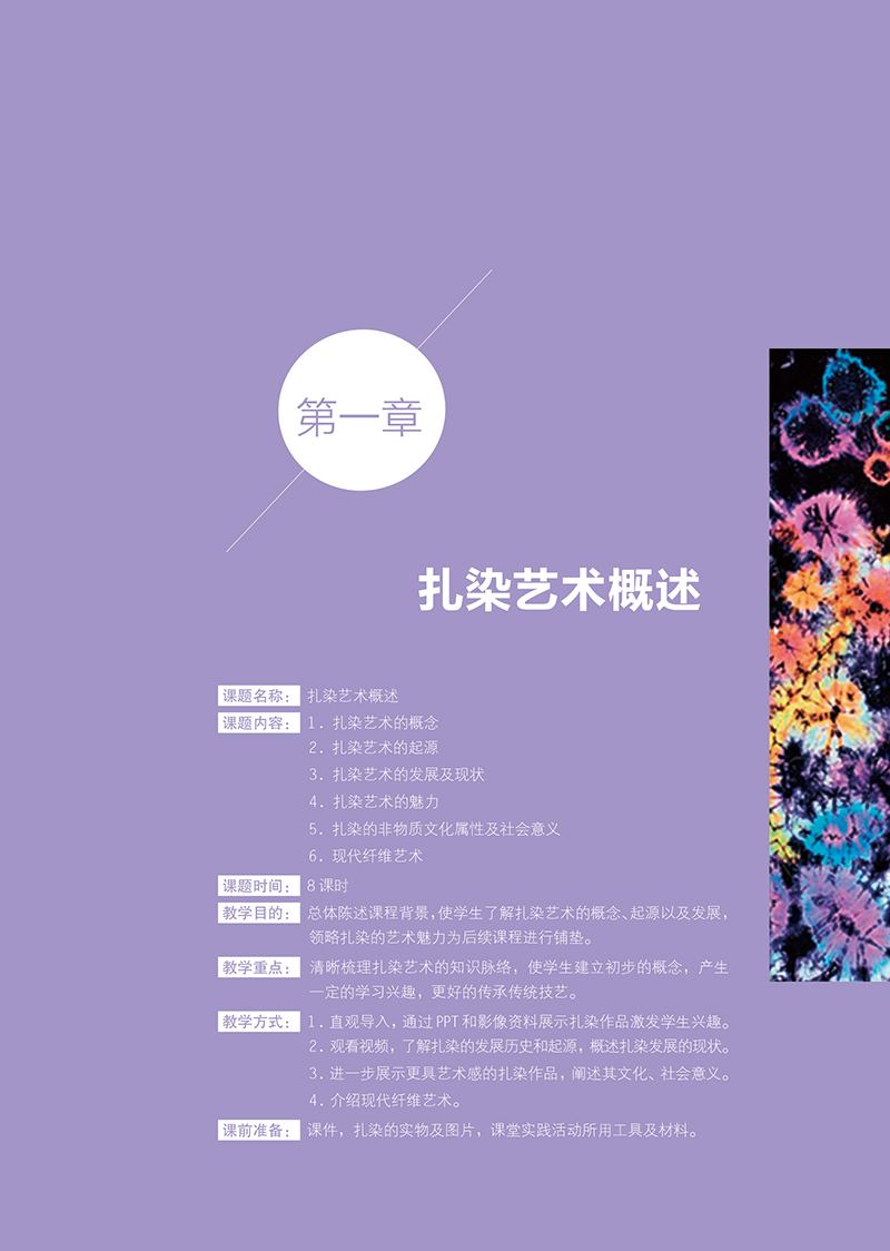 本書將把我們領入一個古老神秘而又時尚絢麗的 紮染藝術世界。與傳統染織類教材不同的是,該書不 僅全面介紹和對比分析了 外紮染藝術的發展歷程 ,而且為讀者提供了大量手工紮染技術的實驗數據和 完整的製作流程,並註重將現代視覺元素及手法融入 傳統的紮染工藝,具有極高的應用價值。本書能夠引 導學生完成從原始素材的收集整理、提煉創新等一系 列實操過程訓練,並通過豐富的圖例分析與參考,直 觀展現其視覺的魅力。