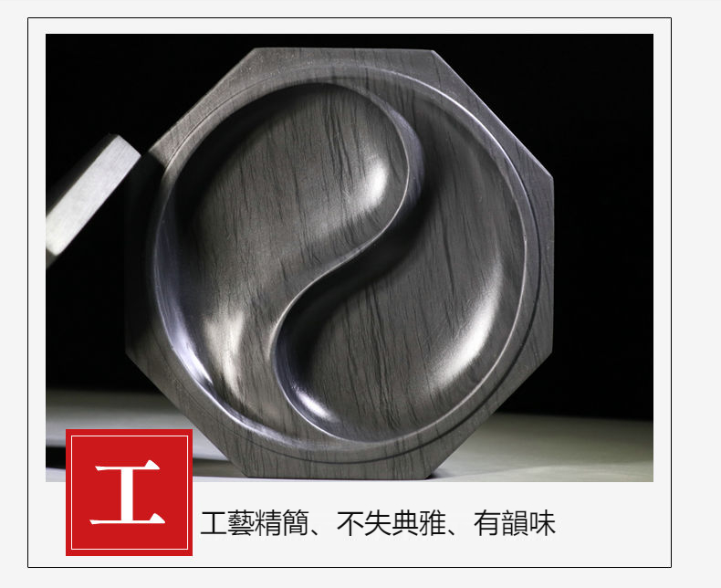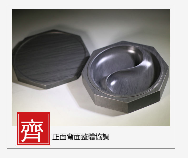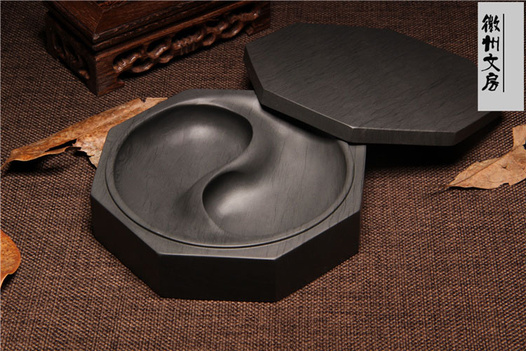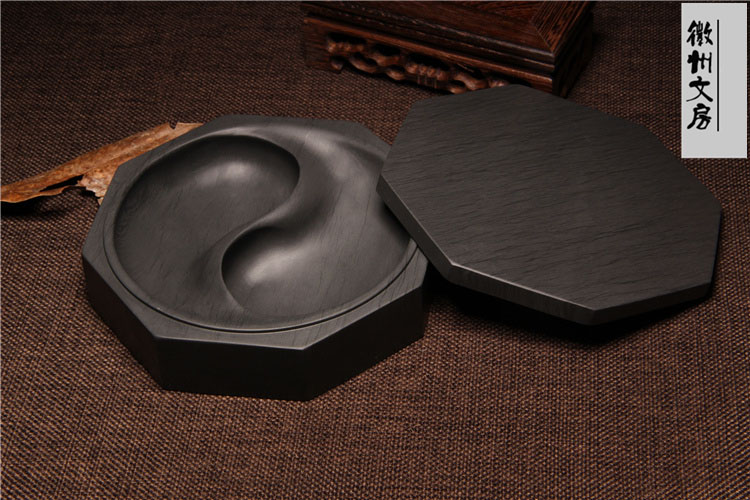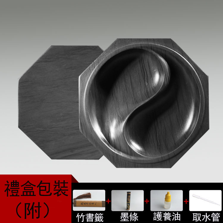八卦太極原石帶蓋水波紋雙墨池歙硯(附 竹書籤,墨條,護養油,取水管)