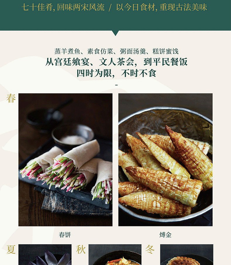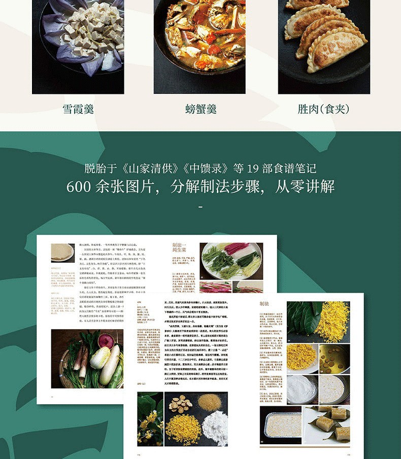 它是食譜,作者根據《山家清供》《中饋錄》等宋元典籍文獻記載還原了75道宋朝美食,按時令編排,囊括宮廷菜、文人菜與平民菜三級,涉及熱葷、素菜、冷盤、羹湯、粥面、糕餅、飲料、果子八類,附有詳細的食材配置與製法步驟圖,上手容易。