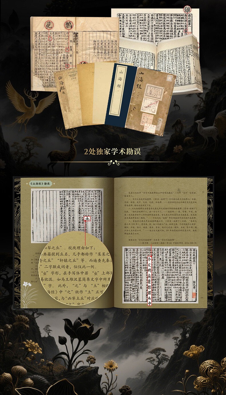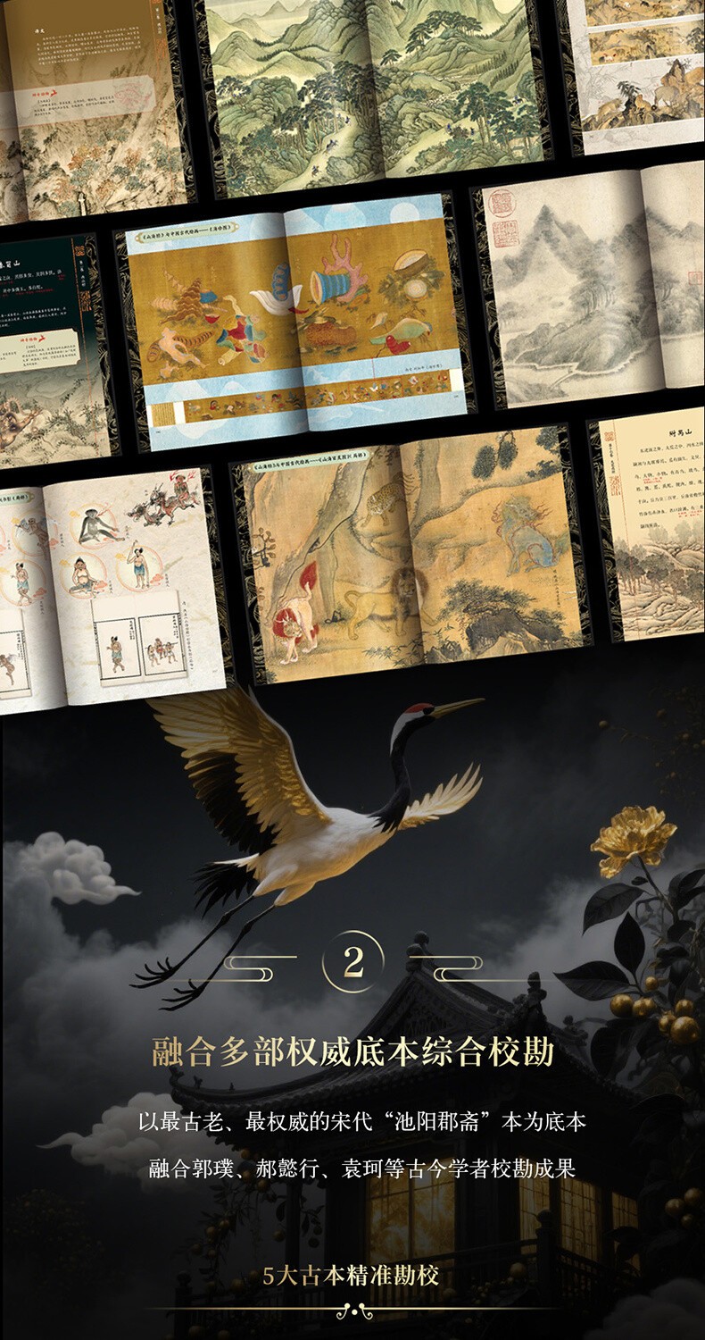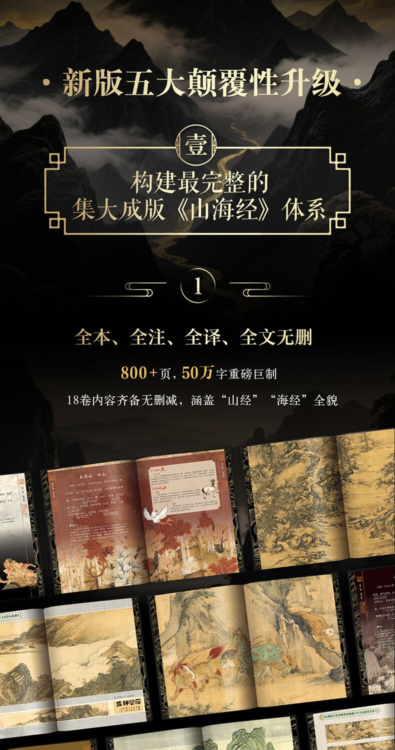 1.全篇目收錄完整的《山海經》:以最古老、最權威的版本宋代「池陽郡齋」本為底本,融合郝懿行《山海經箋疏》、郭璞、袁珂等六大學術版本校勘成果,糾正現存通行本中17處方位描述偏差,確保權威內容校勘成果,糾正現存通行本中17處方權。收錄18卷完整內容,通篇無刪減,涵蓋《山經》《海經》全貌,囊括327種上古獸、165種神奇植物、176位神靈仙人、42類山神祭祀、75個異國文明,系統呈現山海宇宙全貌!