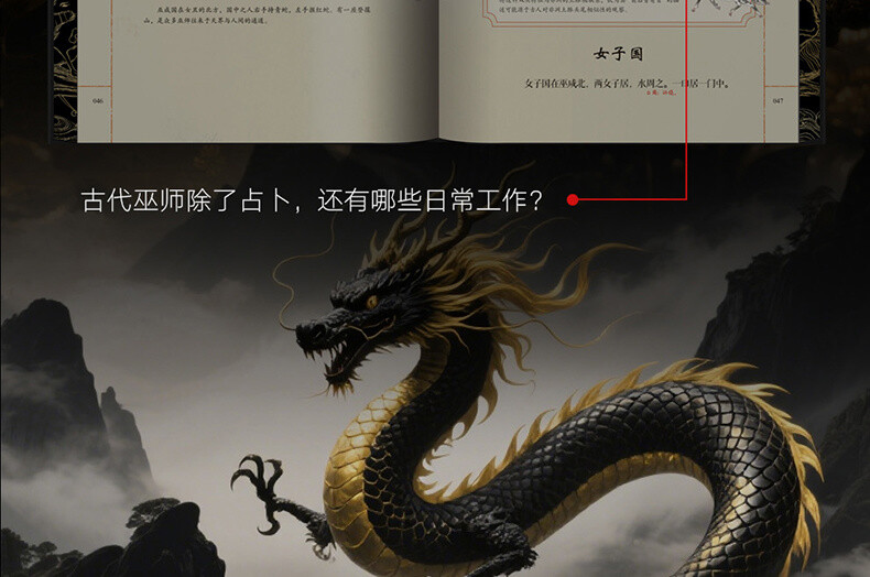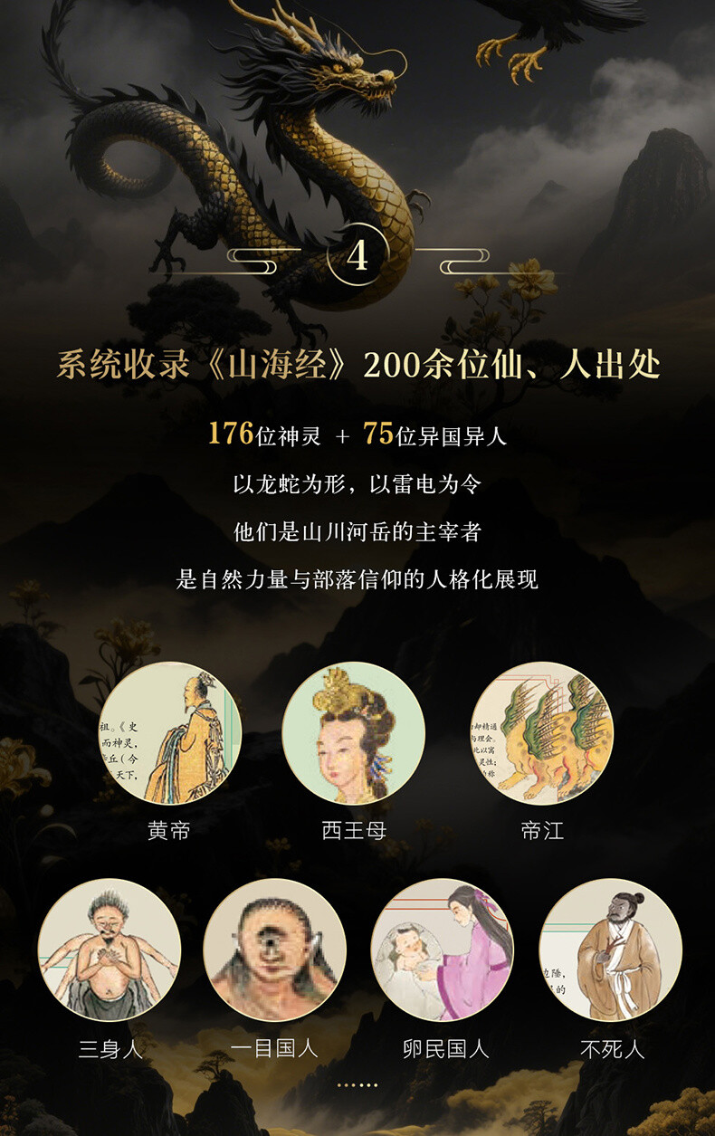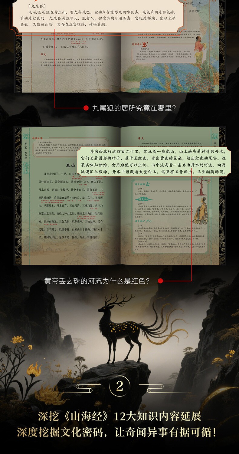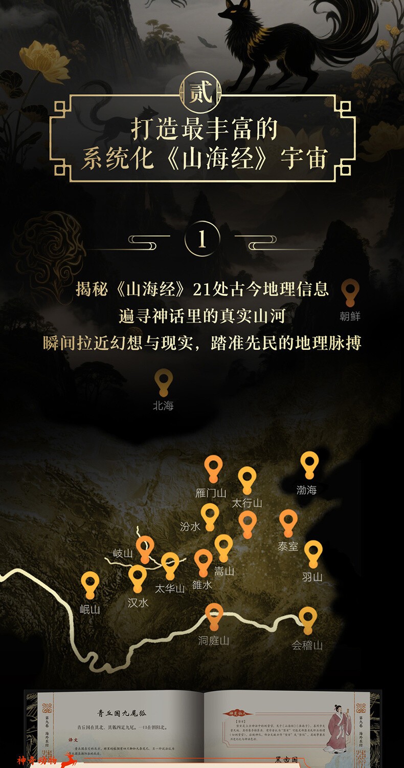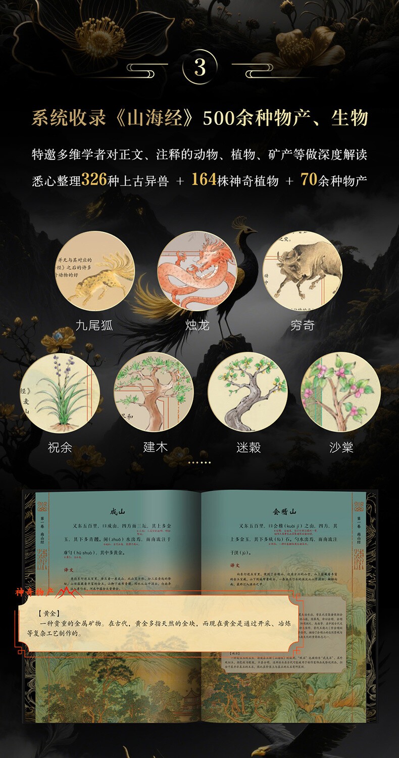 5.一套值得珍藏一輩子的《山海經》,不只書更是藝術品:滿版燙金封面設計,以高端藝術畫冊的標準打造顛覆傳統的《山海經》,一套三冊全部硬殼精裝,收藏有格調,禮贈顯品位!內頁使用仿古藝術紙,模擬古籍手感,閱讀儀式感max!隨書附贈11張《山系復原輿圖》+《華夏世系表》+32頁《神話思維導圖》,既是知識寶藏,也是藝術品級藏書!