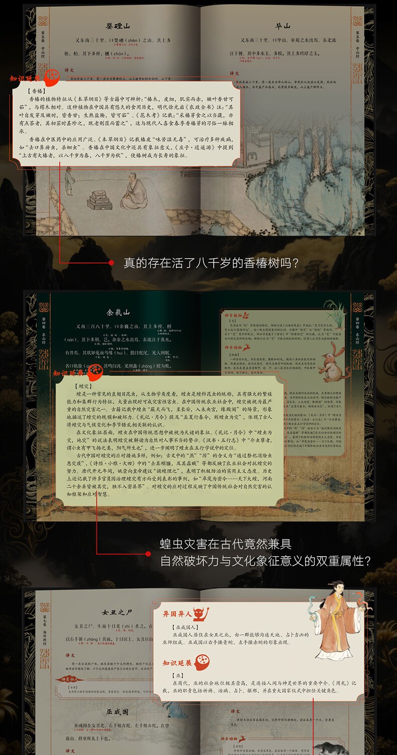 4.一本將知識點全打通的《山海經》:獨家整理70+珍稀物產、22處古今地理對照、21個專有名詞釋義、7個經典神話故事,還融合15幅中外古畫、6首古詩詞、6種中國傳統色等,並引入三星堆等文物考古成果進行文化溯源,將神話、歷史、地理、藝術、文學、考古全面串聯,構建出一張完整的“山海知識圖譜”,讓人越讀越上頭!
