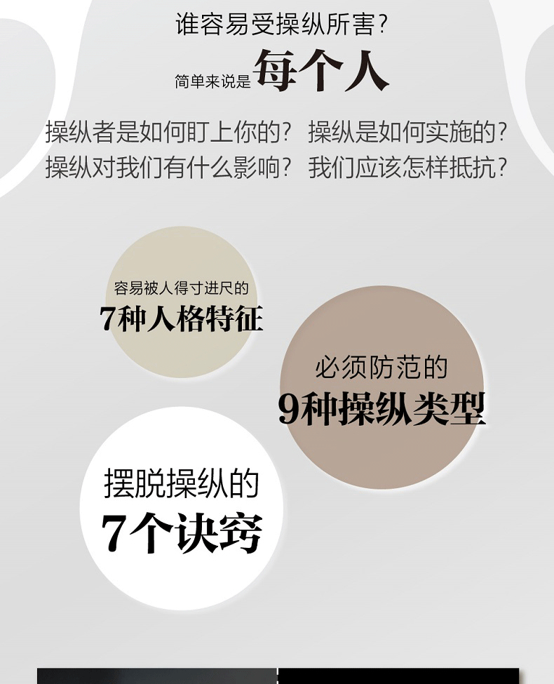 不論男女,都有可能深陷操縱的泥淖,受他人的情感操縱、侮辱,被拖拽進操縱者蓄意或無意的心理遊戲中。而操縱者可能是上司、同事、下屬,也可能是伴侶、朋友和家人。這些“有毒”的人際關係會侵蝕自尊,摧殘心靈,虛耗人生。美國最懂心理操縱的臨床心理醫生、心理學博士哈麗雅特·B·布瑞克講解讓你成為被操縱者的7個弱點,概括了操縱者的9種類型,分析了操縱者的動機、目標和手段,還提供了心理測驗,讓你評估自己是否容易被操縱,是否處於操縱關係之中,並總結概括了抵抗操縱的關鍵7招,幫助你擺脫操縱關係,不做軟柿子,重掌人生的主動權。