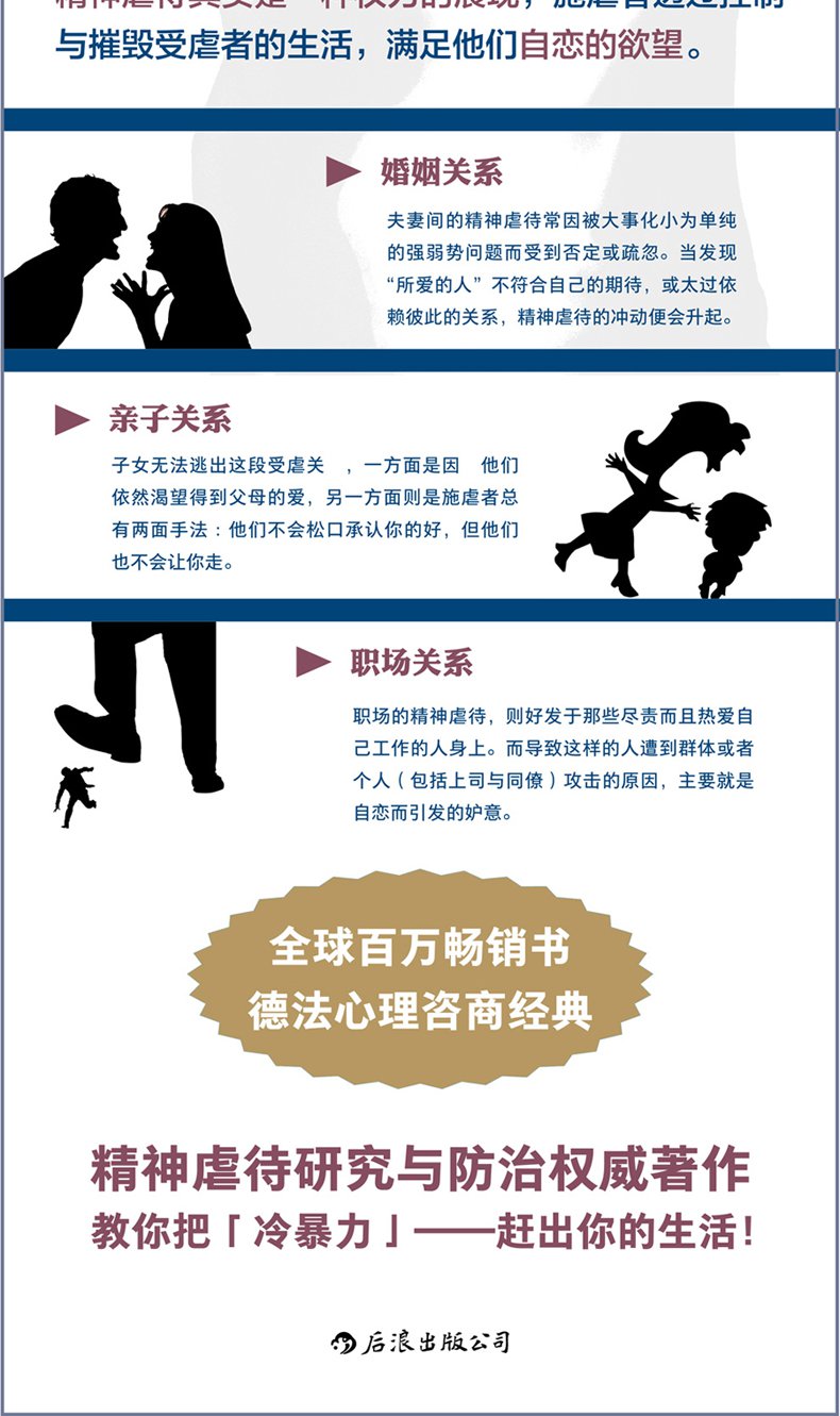 這導致了很多人際關係噩夢的基本形式——情感勒索。勒索者抓住受害者的恐懼感、責任感和罪惡感,雙方一起被困在惡性循環之中。福沃德對情感勒索的根源做了、深刻的分析,並對勒索者和受害者的類型做了歸納。一段關係之所以能墜入勒索的陷阱,是勒索者和受害者雙方的弱點共同造成的。而情感勒索看似以受害者讓步、勒索者滿足告終,實際上侵害了受害者的自我完整性,也讓勒索者的心態更加扭曲,關係中的問題依然沒有得到解決。她告訴我們,面對情感勒索時,如何應對才是正確的,我們可以通過一些簡單的訓練學會擺脫情感勒索的方法。 *重要的是:擺正立場,堅定信心。