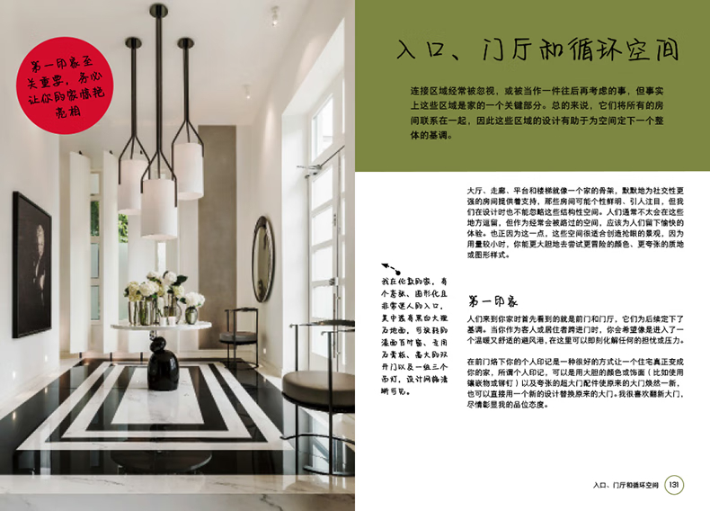 第三部分.各房間的設在這一部分,凱莉赫本將上述設計原則和裝飾元素運用到不同空間的設計中。講述在入口、走廊與流通空間、臥室、餐廳等空間的設計
