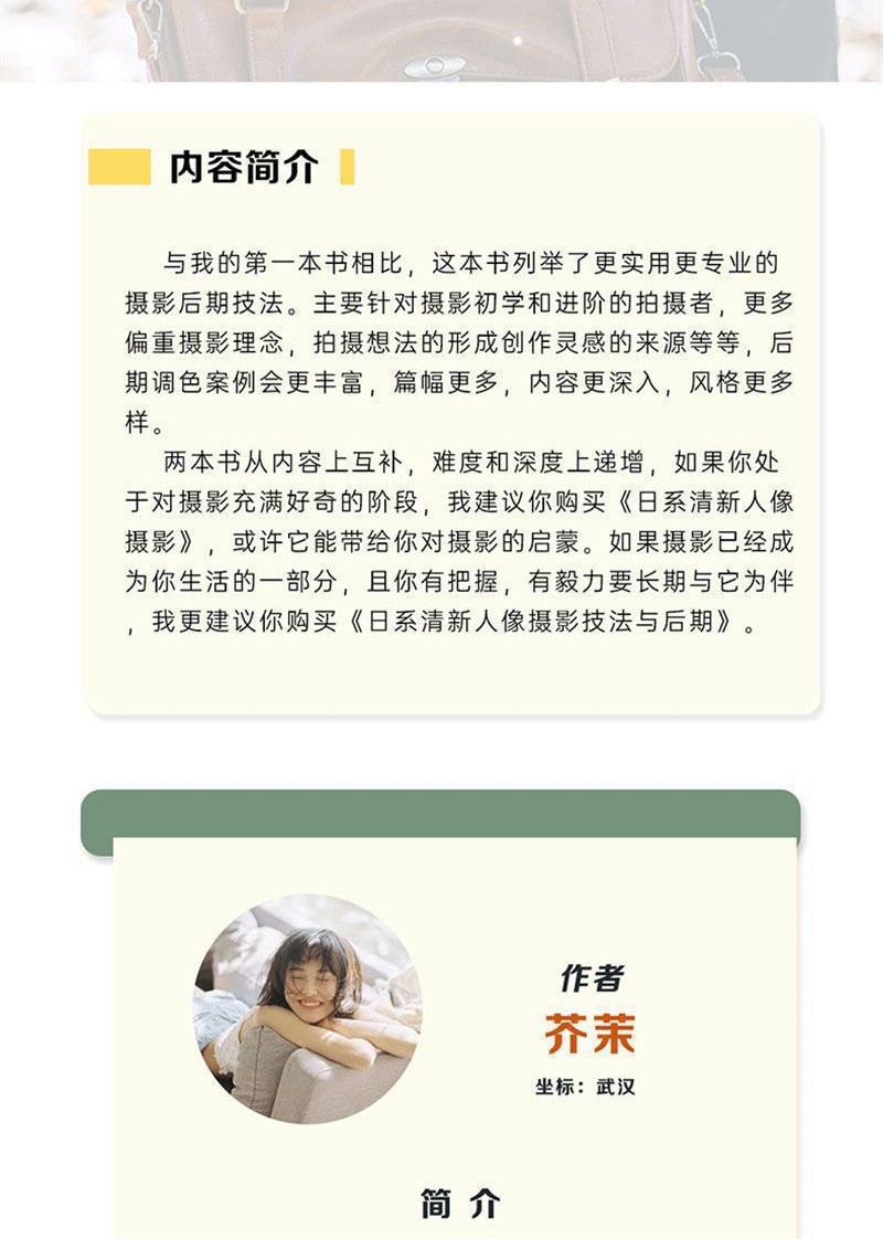 本書立足於為人像攝影初學者打造一本簡單易學的入門讀物。作者係小白出身,在反复的學習、練習過程中,逐步形成較為穩定的拍攝風格,並用其擅長的文字,將這些學習經歷寫進書中。其中不僅有攝影技術的分享,更有關於攝影理念的思考。在輕鬆簡潔的文字中,將其攝影學習中的經驗、誤區,技術娓娓道來,使讀者可以在輕鬆的閱讀中掌握新知識,獲得成長。