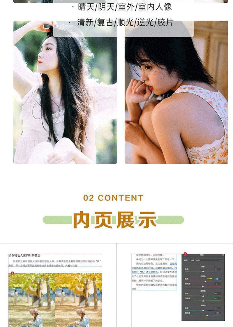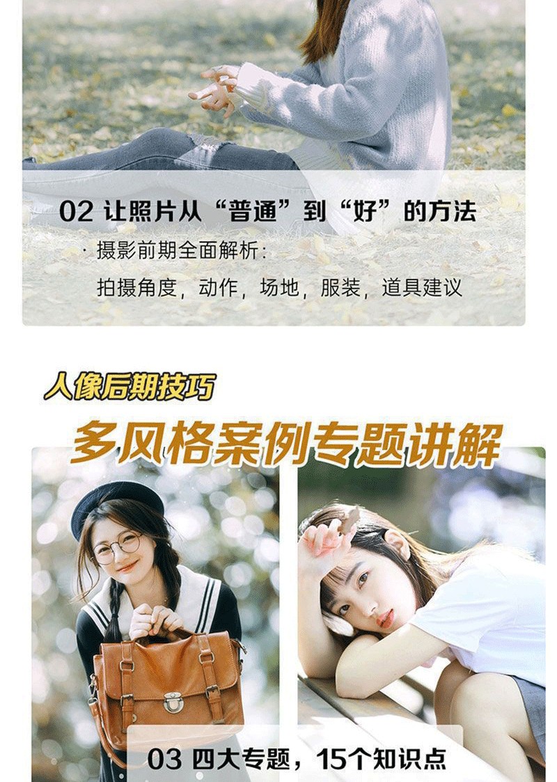 本書是一本人像攝影實戰案例與後期指南,本書採用案例的形式,詳細講解在不同創作場地、不同光線、不同主題的條件下應該如何從準備、到拍攝、到後期,一步步完成一套完整的拍攝流程。作者和模特櫻桃喵走遍了不同城市,在不同場合下拍攝了15組少女風人像攝影案例,並配有現場場地分析以及拍攝花絮以供對比學習。每組案例都配有後期修圖步驟,兩者結合起來,讓讀者能直觀地體驗攝影師拍攝以及後期的全過程。