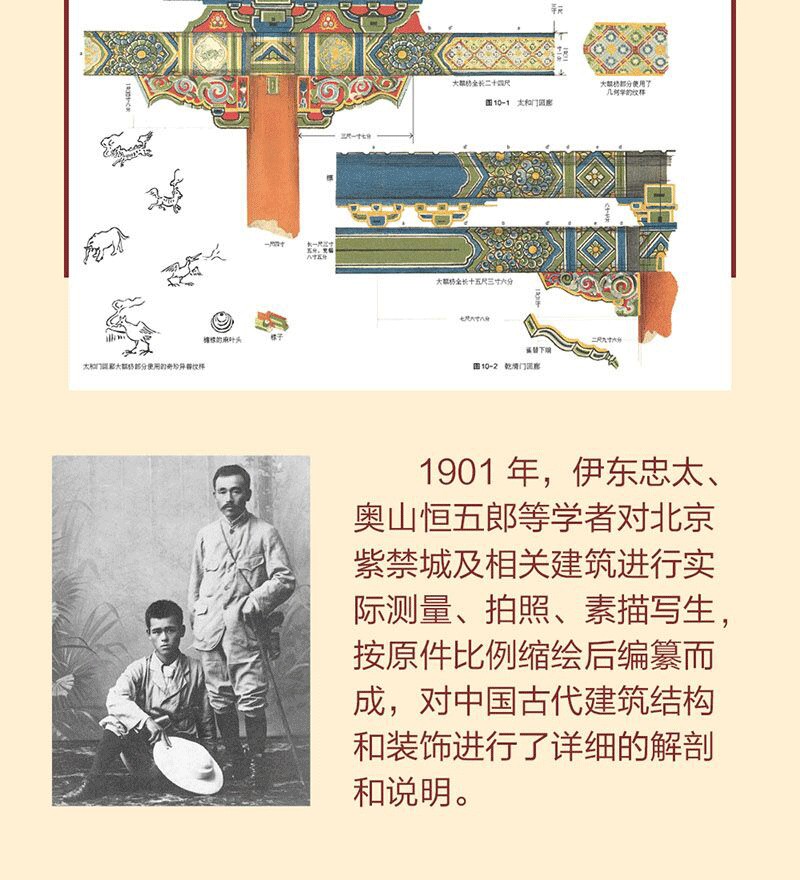 本書是1901 年伊東忠太、奧山恆五郎等學者對北京紫禁城及相關建築進行實際測量、拍照、素描寫生,按原件比例縮繪後編纂而成,對中國古代建築結構和裝飾進行了詳細的解剖和說明。主要描述了中國古代建築裝飾的種類及搭配、分類建築的不同色彩使用和整體建築的色彩搭配,分析了天花板、梁、柱、斗拱、牆面、台階、寶座、門廊、屋瓦等建築裝飾,以700餘幅精美的手繪圖片完整地呈現了100年前北京紫禁城的建築風貌。