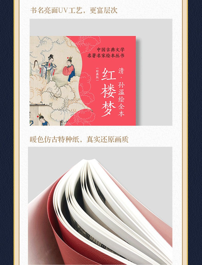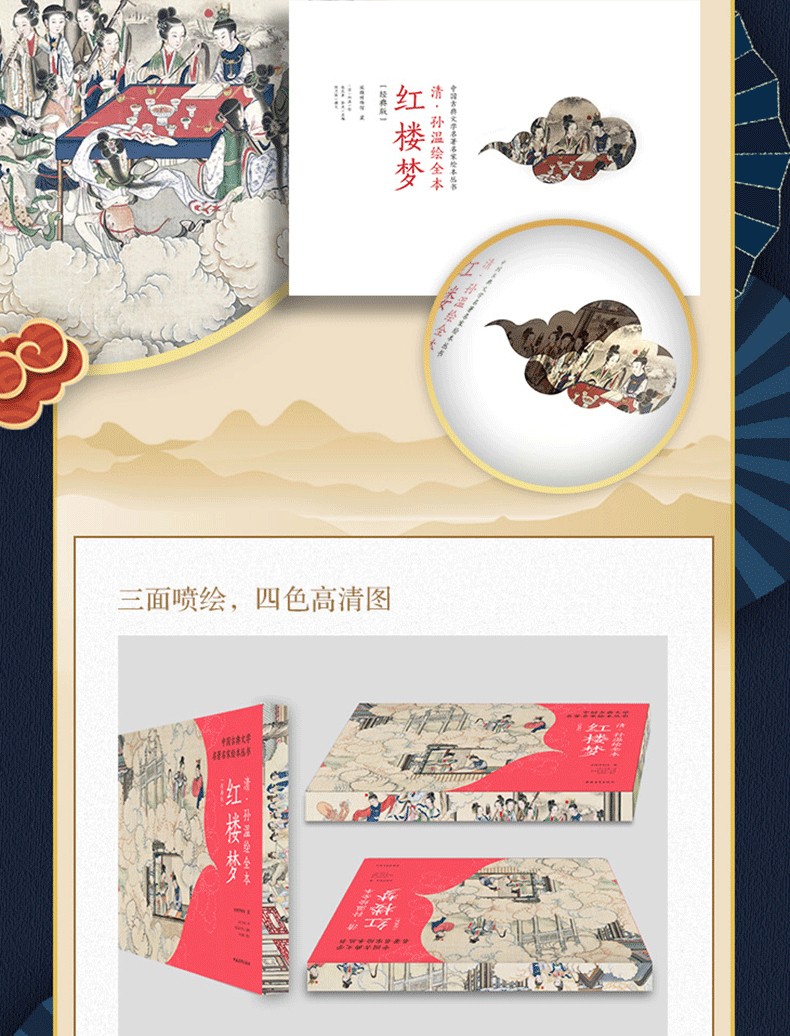本書透過230幅絹本彩繪再現《紅樓夢》的主要故事情節、人物和場景。橫開本採用裸脊鎖線裝訂,可實現180度無障礙展開閱讀,內文仿古特種紙精確還原畫作色彩和細節。同時,書特聘請中國紅樓夢學會權威專家為每幅畫面撰寫文字,圖文交相輝映,形成一部「節本」《紅樓夢》,為讀者用最短的時間閱讀中國古典名著提供了難得的素材。 2019年,中國青年出版社與全球頂尖出版商合作出版了該書的中、英、法、意四個語種的限量珍藏版,創造了《紅樓夢》首次中、英、法、意四個語種同時出版的記錄。特裝刷邊版《清.孫溫繪全本紅樓夢》(經典版)保留了限量珍藏版的原有圖文,並以16開軟精裝的形式再次出版,同時精選經典場景圖對書進行刷邊,進一步提升收藏價值,讓更多的讀者有機會了解中國文化和《紅樓夢》這一文學巨著,並透過此書獲得一種美的閱讀感受。