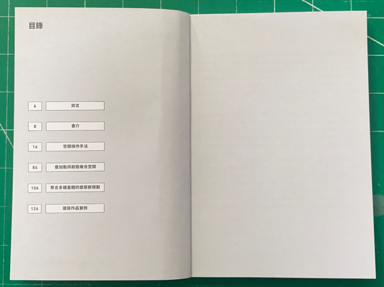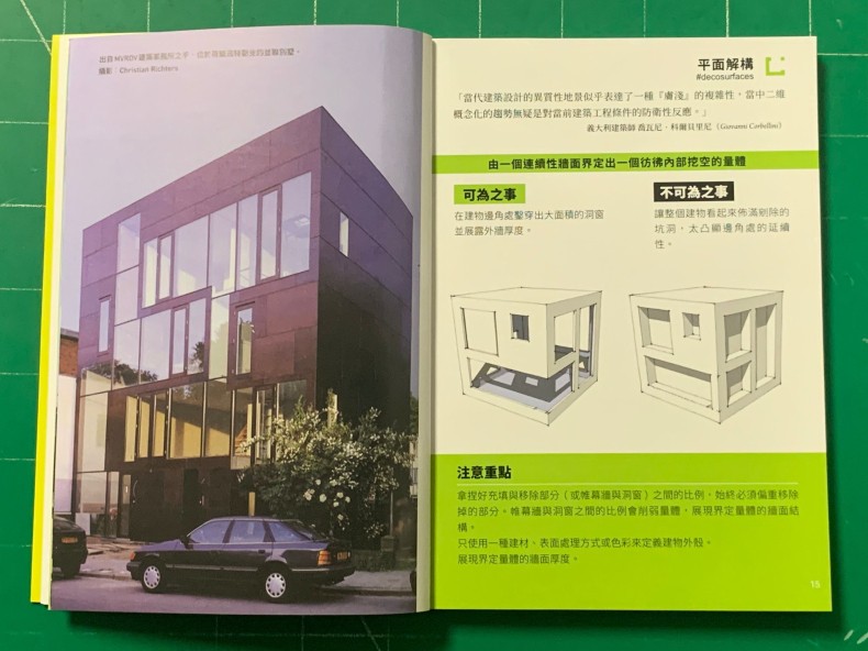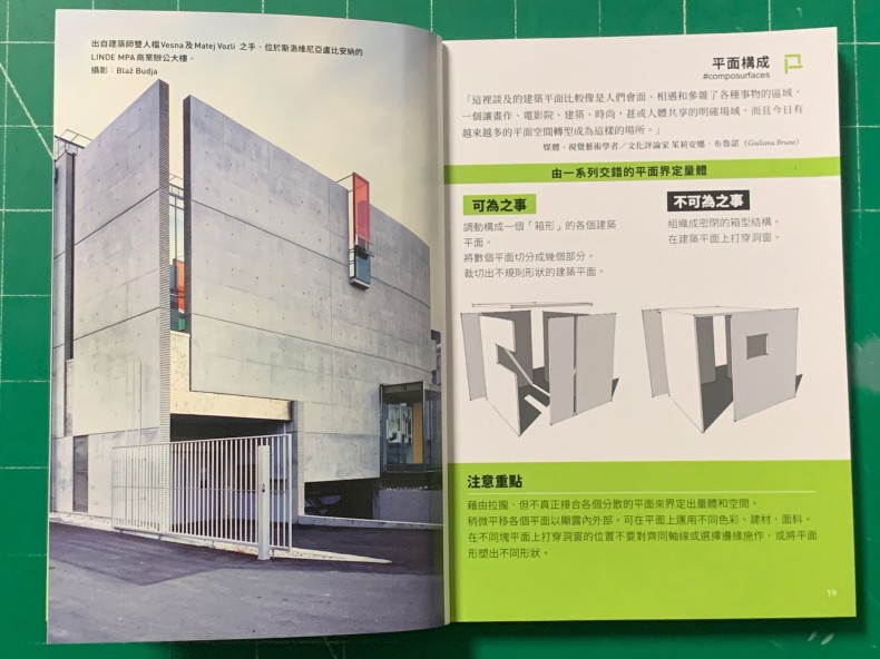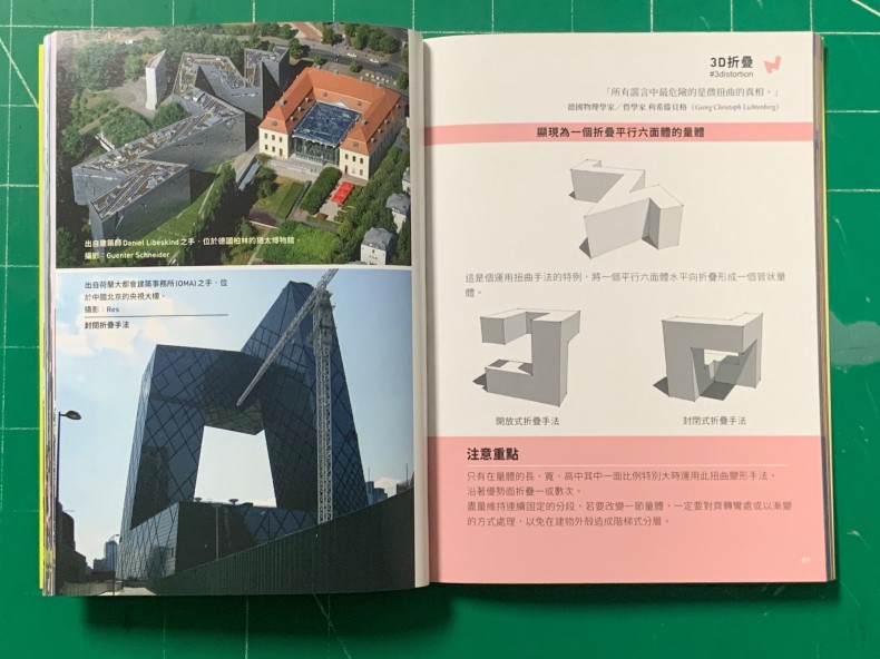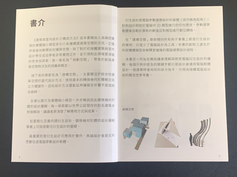 全書藉由圖示與實體縮小模型逐步解說當代空間構成的方法如折疊平面或結合曲線的設計。每一章開頭都以世界公認現存的知名建築為例做解說,讓讀者更清楚了解應用方式與成果。