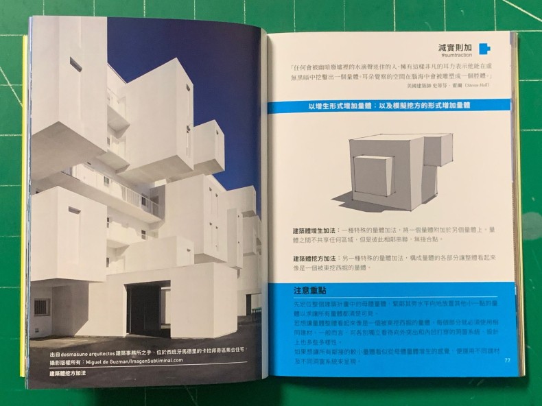 這本書藉由人為操控變換的實體縮小模型來引導各種創造建築空間的方式。它循序漸進地解釋如何構建建築空間,除了對於初接觸建築與室內設計學生或自學者非常實用之外,並引領更深遠的思考和探索。