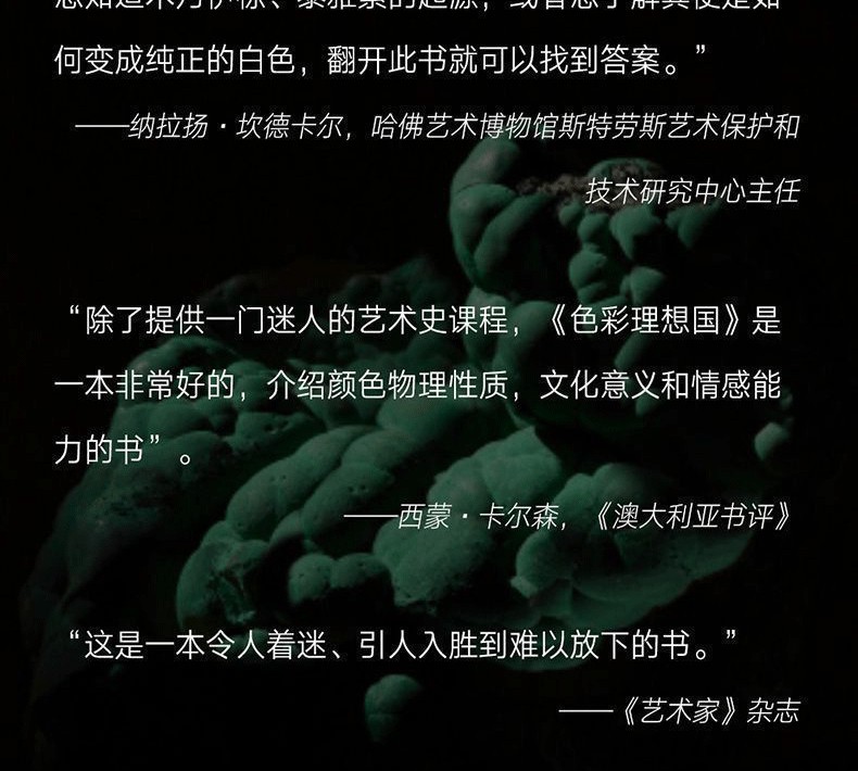 從遙遠的古代到科技飛躍的現代,從碾碎的甲蟲到焚燒後的動物骨頭,再到煉金術和種種意外發現,《色彩理想國:圖說顏色的歷史》為你一一揭秘人類歷史上近六十多種非凡的顏料及其背後的故事。