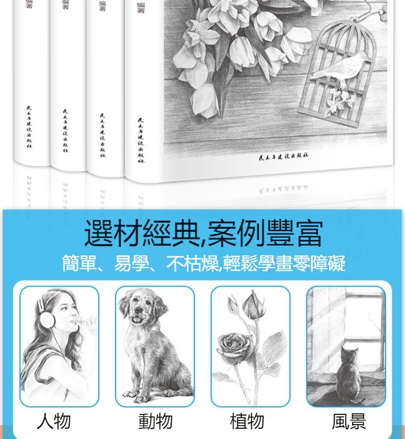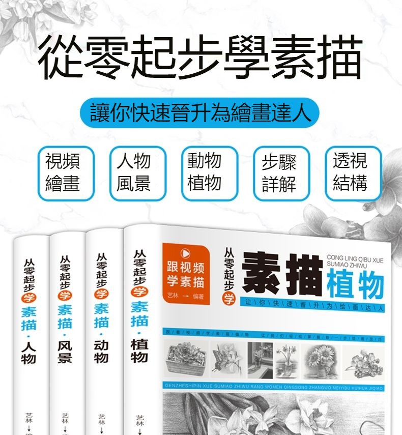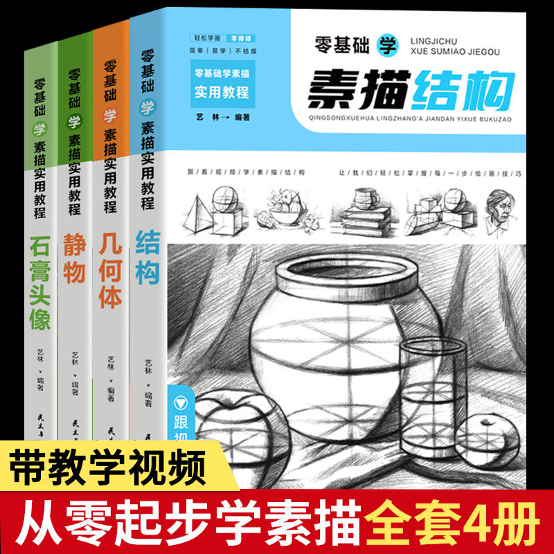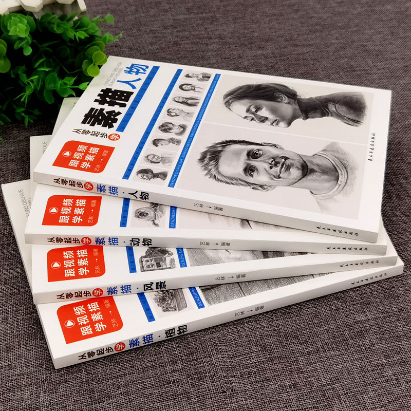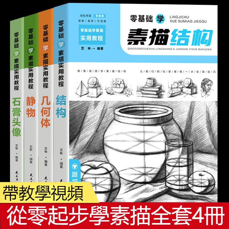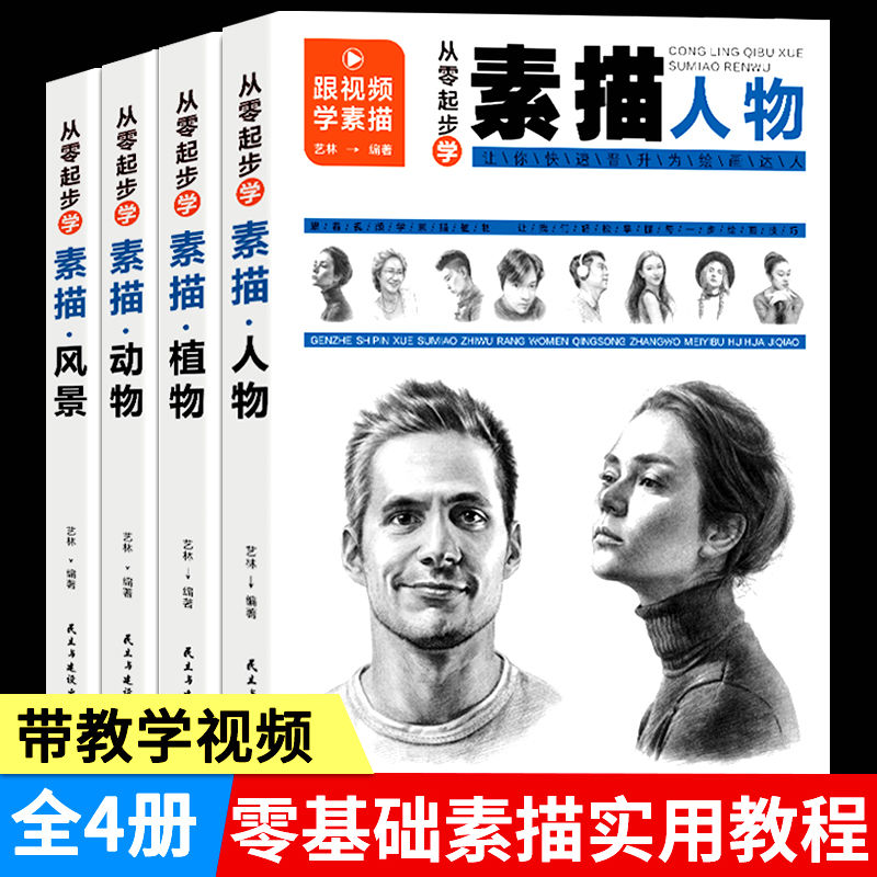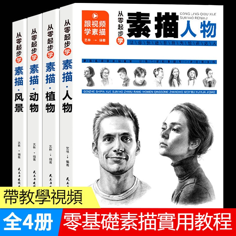 全4冊 素描書零基礎教程教材從入門到精通自學臨摹風景人物美術繪畫,附視頻教程