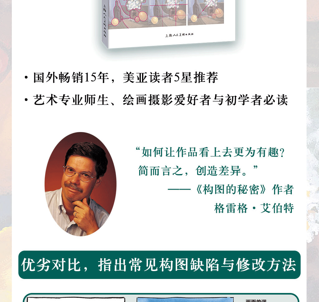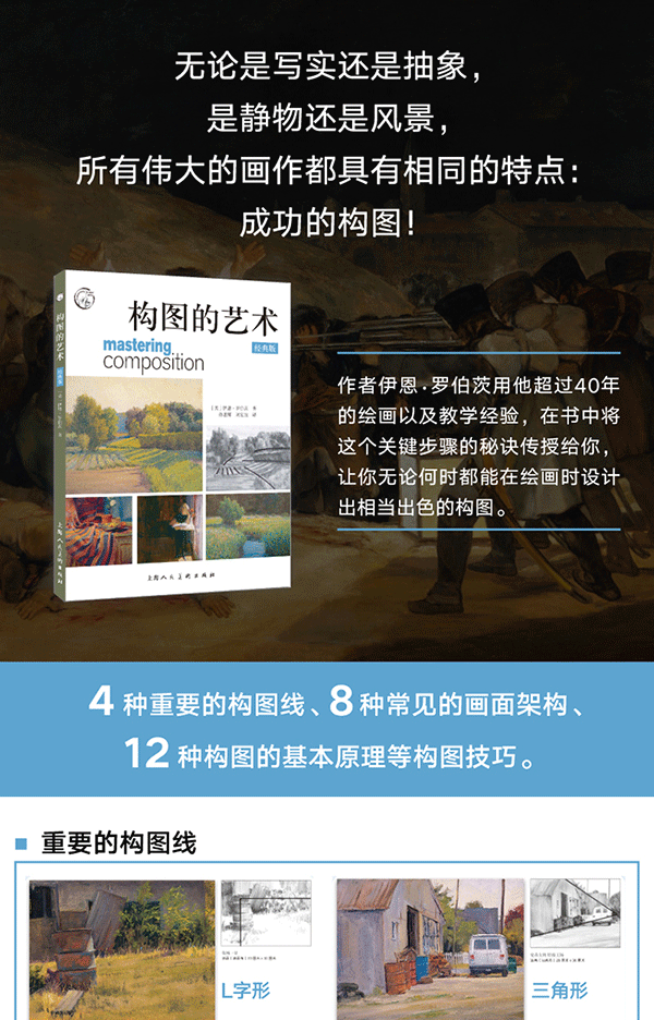 無論是寫實還是抽象,是靜物還是風景,所有偉大的畫作都具有相同的特點:成功的構圖。如果缺少這個特點,就算是再吸引人的風景事物,在畫面上也只能呈現出平淡無奇的效。本書提供了一系列經過證實的方法,將繪畫過程中這個關鍵步驟的秘訣傳授給你,讓你無論何時都能在繪畫時設計出相當出色的構圖。作者伊恩·羅伯茨用他超過40年的繪畫以及教學經驗,向你展示怎樣進行構圖。跟隨這本書學習你將會掌握許多相當實用的構圖技巧。當開始使用這些技巧來構思繪畫作品後,你的畫作將有明顯的改善,你所選擇的架構將驅使你更加大膽地進行繪畫。本書將帶領你一起探索作為藝術家的真正潛能,並且享受繪畫創作所帶來的愉悅。