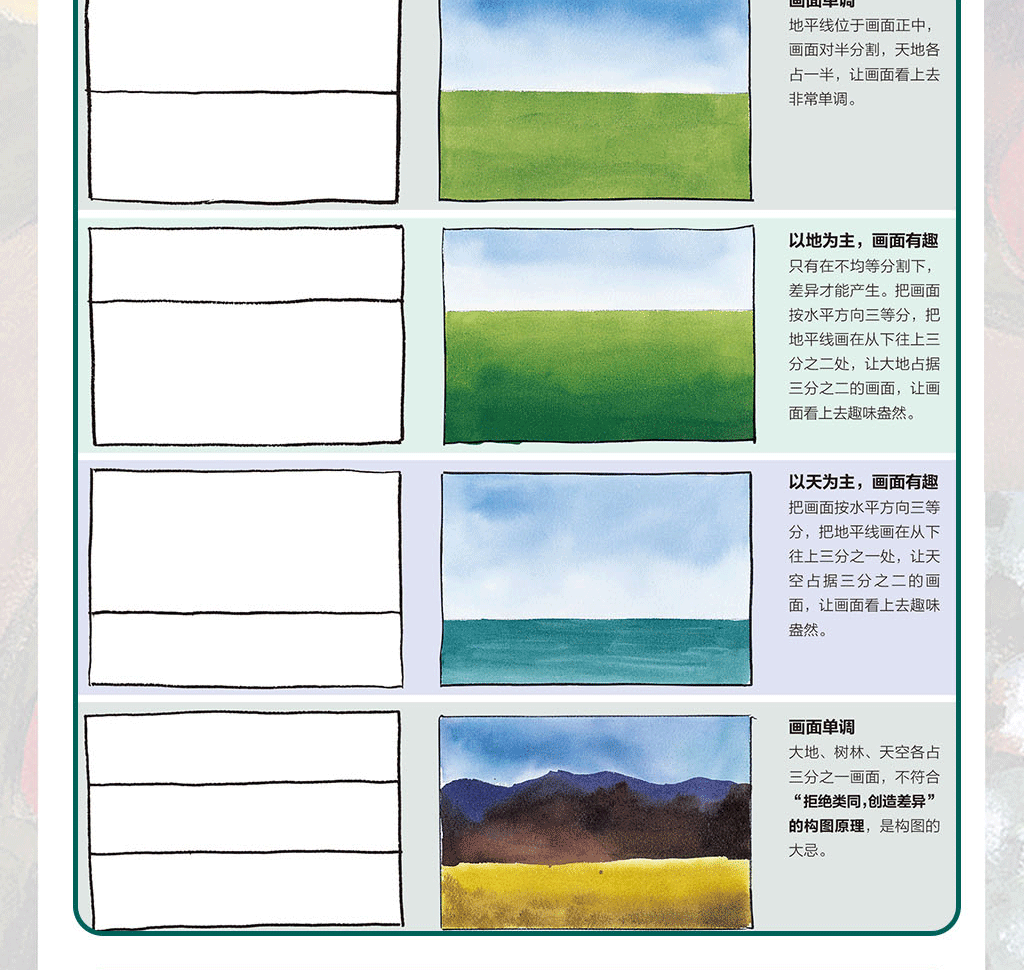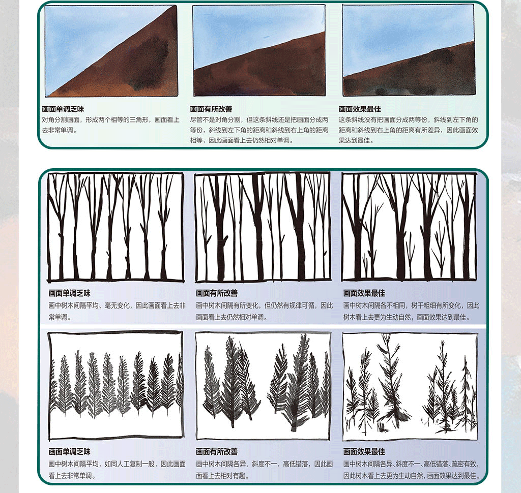 用明暗體塊來創造興趣點和戲劇性·考慮抽象體塊,而不是物體 ·找尋主要的抽象體塊·取景框的使用·參考較好的照片來著手繪畫·找出滿意的構圖·改變你的視角·臨摹你喜歡的畫作 ·大限度地利用每一次參觀美術館的機會·*天一幅構圖·素描小竅門·縮略圖·示