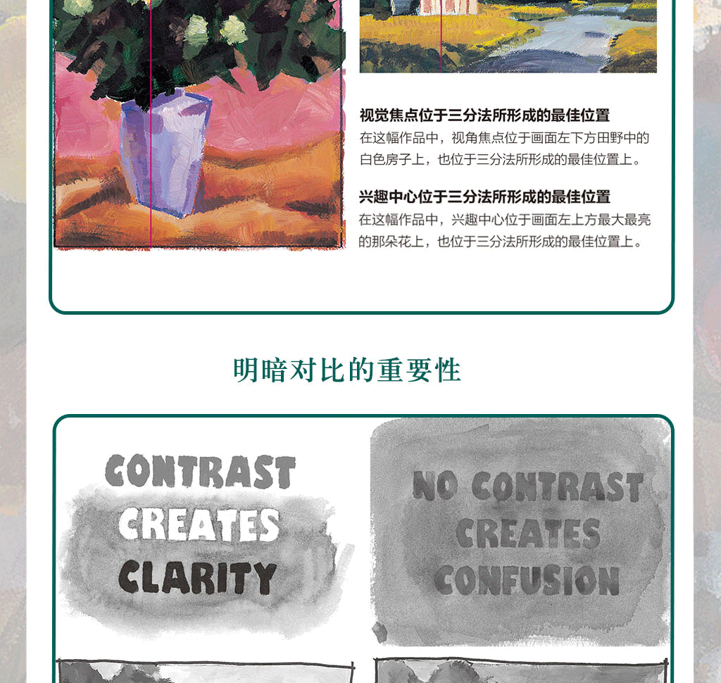 將你的構圖當一個整體來揣摩·調整對比度來更好地引導視線·視覺干擾是什麼? ·向學生們的作品學習·示範 :將視線*領到畫面之中·示範 :考慮畫面上的流動感