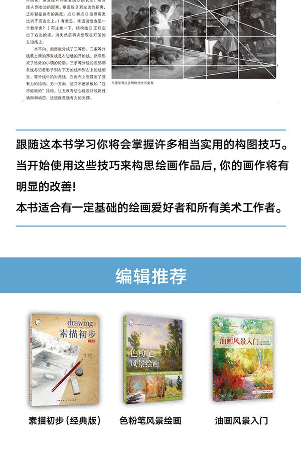 構圖究竟有多重要?如果你總覺得自己的畫哪裡不對勁,卻又挑不出透視、線條、色彩的錯誤,那麼一定是構圖出了問題。這本書只會告訴你一條構圖法則,卻是一條高度濃縮了快速創作you秀作品的技法的黃金法則。它能夠運用到繪畫的各個方面——繪畫對象的間隔設置、大小安排、色調對比、明暗協調、顏色搭配等等。作者將以豐富的圖例,詳細闡述這一構圖法則在作畫過程中的實際運用,告訴你哪些畫作是以構圖取勝,糟糕的畫面應該如何修改,以及哪些技巧能夠使平淡的畫面變得生動有趣、吸引目光。只要理解了這條構圖法則,你將輕鬆發現自己畫作中的不足之處,並能從各個角度完善畫面,將畫技提升到一個新的高度。對於希望從一開始就掌握正確繪畫方法的初學者,這本書也會為你指明方向,避免彎路。