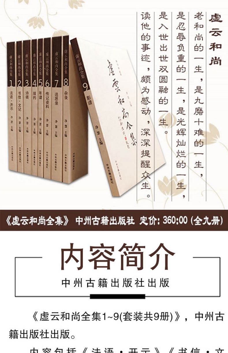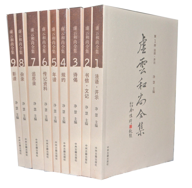 《傳記資料》部分,所收集的以一手資料為主,包括兩個面向:一是現成的傳記文章,二是從報刊、寺誌等文獻中蒐集到的有關虛老行蹟的零星記載。至於後人在一手資料的基礎之上所完成的傳記著作,如宣化上人主編的《虛雲老和尚畫傳集》、何明棟《虛雲和尚傳》、釋惟升《虛雲老和尚的足跡》等書,則不在《虛雲和尚全集(套裝全9冊)》的範圍之內。