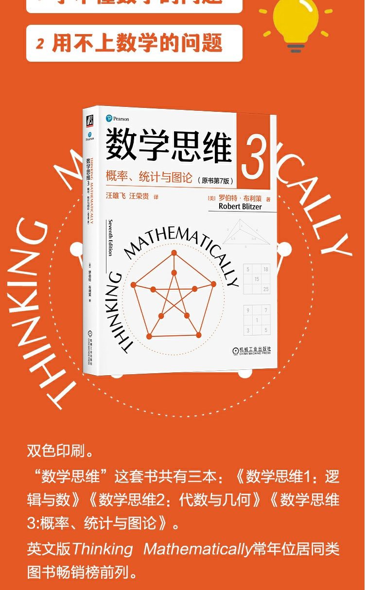 本書是一本經典的數學思維入門圖書,從最基本的概率、統計與圖論的知識開始,將不同方面的數學內容巧妙地加以安排和設計,使得它們在邏輯上層層展開,形成易於理解的知識體系。本書以趣味性的寫作風格和與實際相關的例子,吸引讀者的數學學習興趣,培養讀者的數學思維,體現數學知識在日常生活中的重要性。本書內容豐富,表述通俗易懂,例子講解詳細,圖例直觀形象,適合作為青少年數學思維課程的教材或閱讀資料,也可供廣大數學愛好者、數學相關專業的科研人員和工程技術人員自學參考。