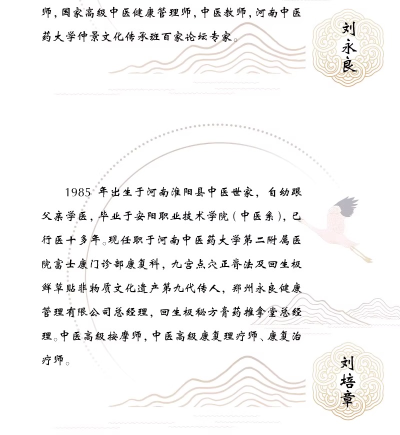 劉培章,劉永良長子,1985年出生於河南淮陽中醫世家,自幼跟父親學醫,畢業於安陽職業技術學院(中醫系),已行醫10餘年。現任職於河南中醫藥大學第二附屬醫院富士康門診部復健科。九宮點穴正脊經筋療法及回生極鮮草貼非物質文化遺產第九代傳人,鄭州永良健康管理有限公司總經理,回生極秘方膏藥推拿堂總經理。中醫高級按摩師,中醫高級復健物理治療師,復健治療師。