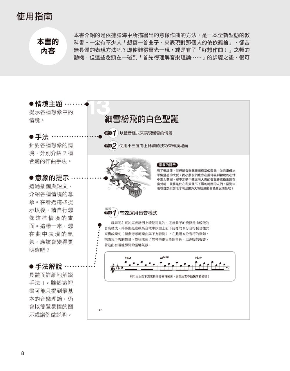 本書在和弦作曲法的主流中,跳脫艱澀的理論,直接就作曲和配樂常見的主題情境,提出包含和弦、節奏、調性、音階、樂器音色等上百項技法,只要設定好意象和情感,就能轉換成合適的音樂形式,創作出令人感同身受的樂曲。