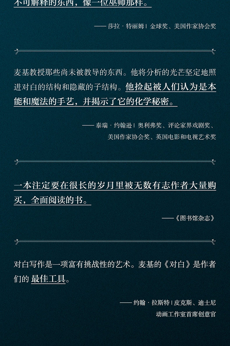 《對白(文字舞台銀幕的言語行為藝術)(精)》是美國電影教父羅伯特·麥基講述電影對白創作心得的作品,是作者繼《故事:材質、結構、風格和銀幕劇作的原理》後又一部新作。本書以一百多部影片作為示例,向讀者重新定義對白,講述對白的功能、表達內容、形式、技巧,對對白的修改提出指導,以生動的例子解析如何創造對白,本書對當代電影對白創作有一定的指導意義。