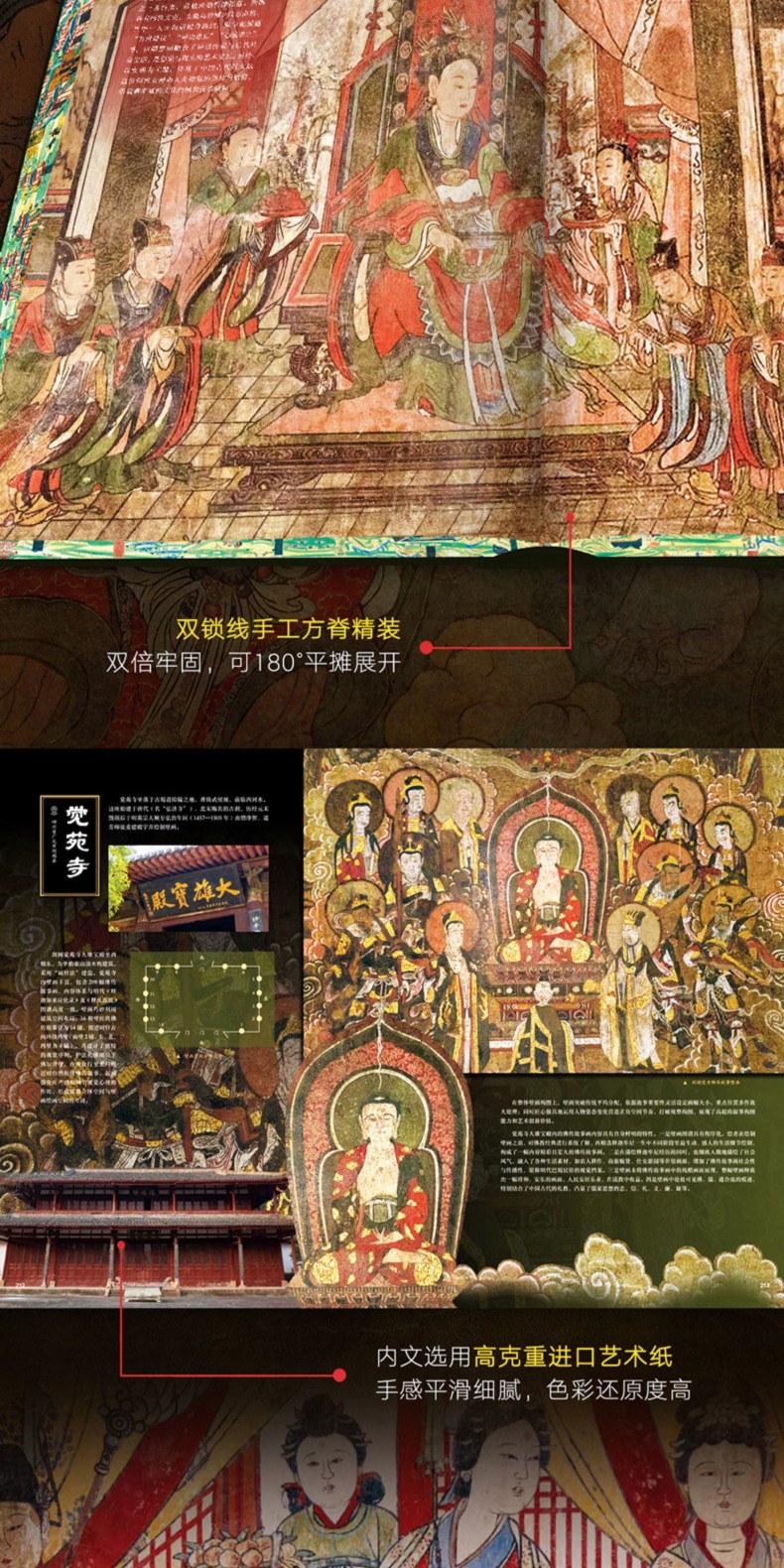 3. 1000張高清絕美插圖,搭建中國壁畫終極視覺檔案庫:既有壁畫全景圖,也有局部圖、細節圖帶領讀者近距離欣賞每幅壁畫,連壁畫斑駁的肌理,以及畫中人物的神態、衣紋都清晰可見,將東方美學展現地淋漓盡致,讓讀者在潛移默化中提升美學素養。還有多幅實拍圖、空拍圖展示壁畫的實際位置、分佈,讓讀者得以全方位、多角度觀賞中國壁畫。