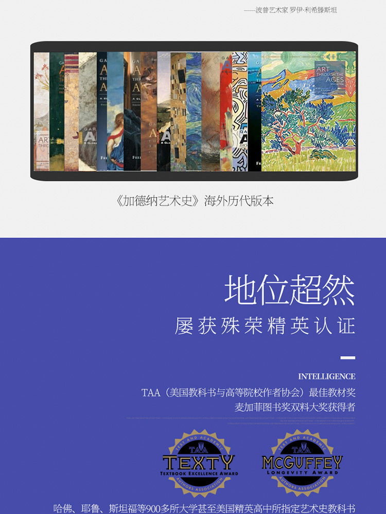 《加德納藝術史》經典版譯自世界知名藝術史 Gardner’s Art Through the Ages 第15版。本書自海倫 加德納1926年首次出版以來,一直廣受好評,不斷再版,堪稱讀者多、流傳廣的藝術通史;本書先後被哈佛、耶魯等著名大學甚至美國精英高中選為教材。本書遵循加德納的基本框架,以“全景化”視角展示藝術發展美的歷程。全書共38章,近125萬字,收錄近1700張高清圖片;涵蓋從史前到現當代藝術,廣涉繪畫、雕塑、建築、設計、攝影及工藝美術等諸多藝術門類。