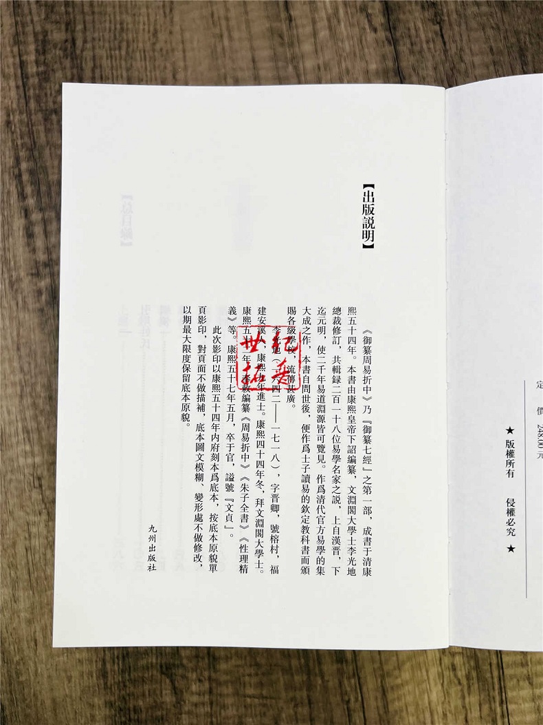 《御纂周易折中》乃「御纂七經」之第一部,由康熙皇帝下詔編撰,文淵閣大學士李光地總裁修訂,四十九名翰林進士等參與編撰,輯錄二百一十八位易學名家之說,上自漢晉,下達元明,使二千年易見道源皆可見道源皆可見。本書作為清代官方易學的集大成之作,自問世後便作為士子讀易的欽定教科書而頒賜各級學校,流傳甚廣。
