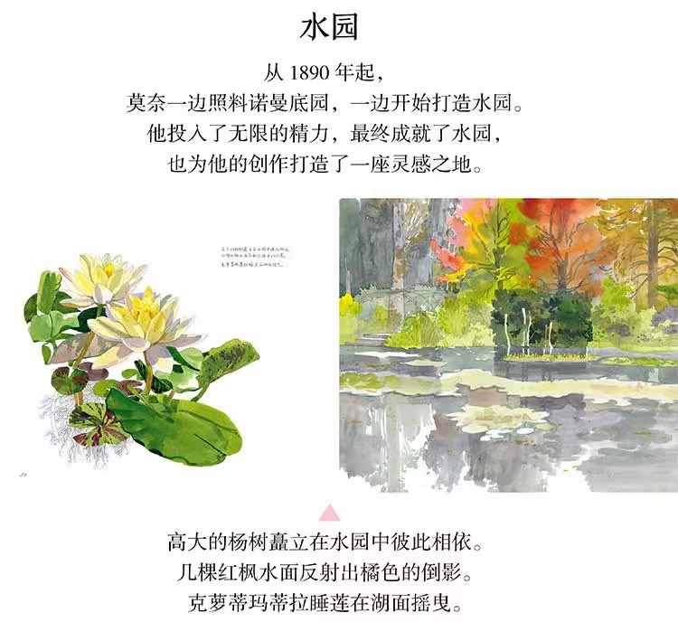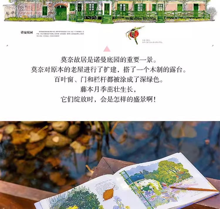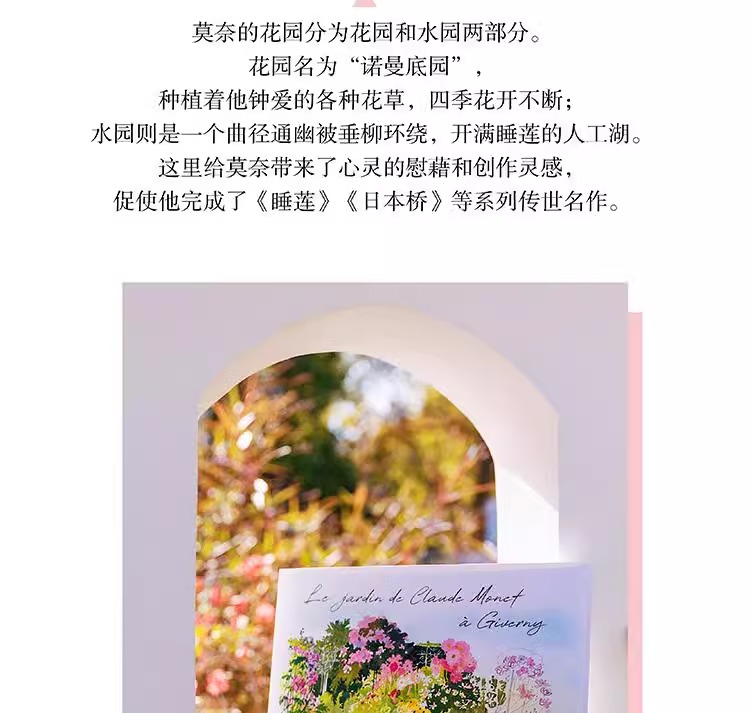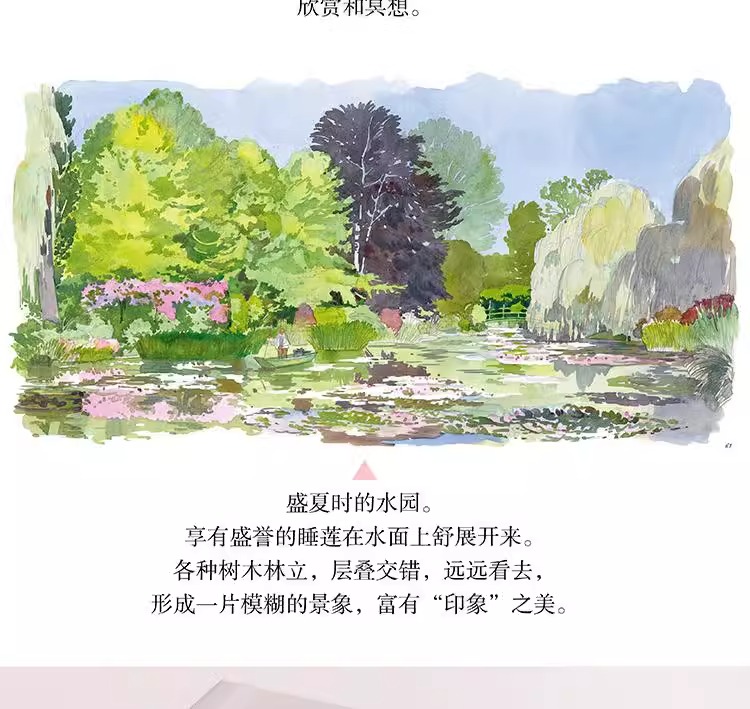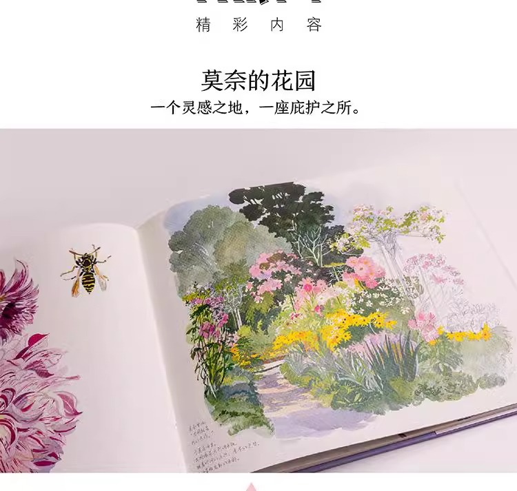 本書是一本人文主題的水彩畫集,用圖文並茂的方式為大家介紹了莫內親自設計、精心打造、視為珍寶的花園。莫內的花園分為花園和水園兩部分,花園名為“諾曼底園”,種植著他鍾愛的各種花草,四季花開不斷;水園則是一個曲徑通幽被垂柳環繞,開滿睡蓮的人工湖。這裡為莫內帶來了心靈的慰藉和創作靈感,促使他完成了《睡蓮》《日本橋》等系列傳世名作。本書以圖文並茂的形式帶領讀者走進畫家、園藝家莫內的繽紛世界,探訪這片令人心馳神往的世外桃源。