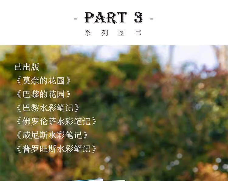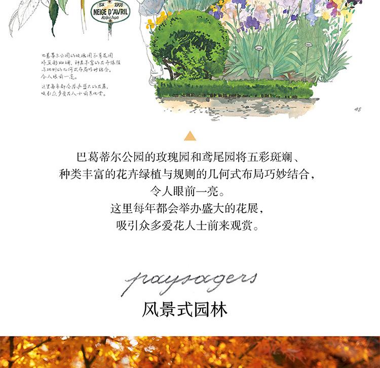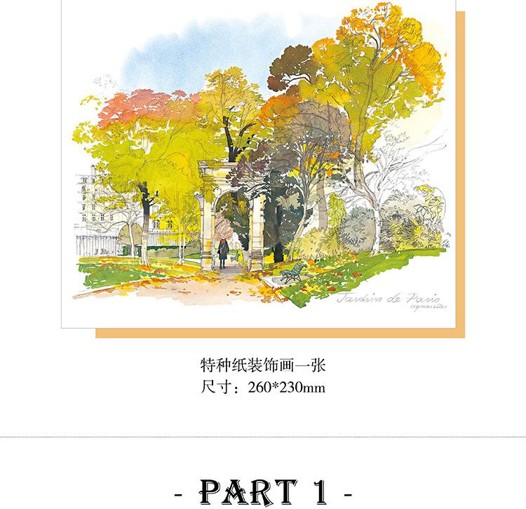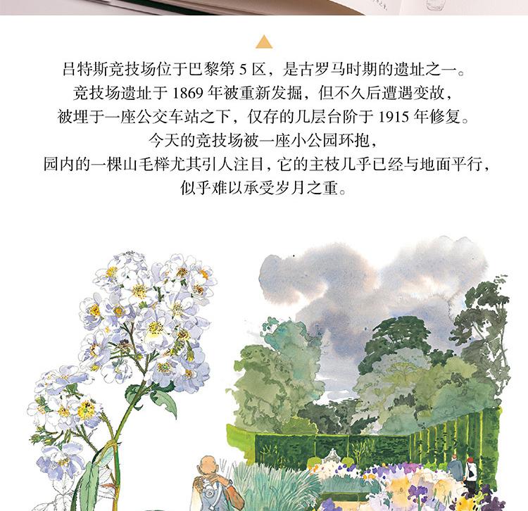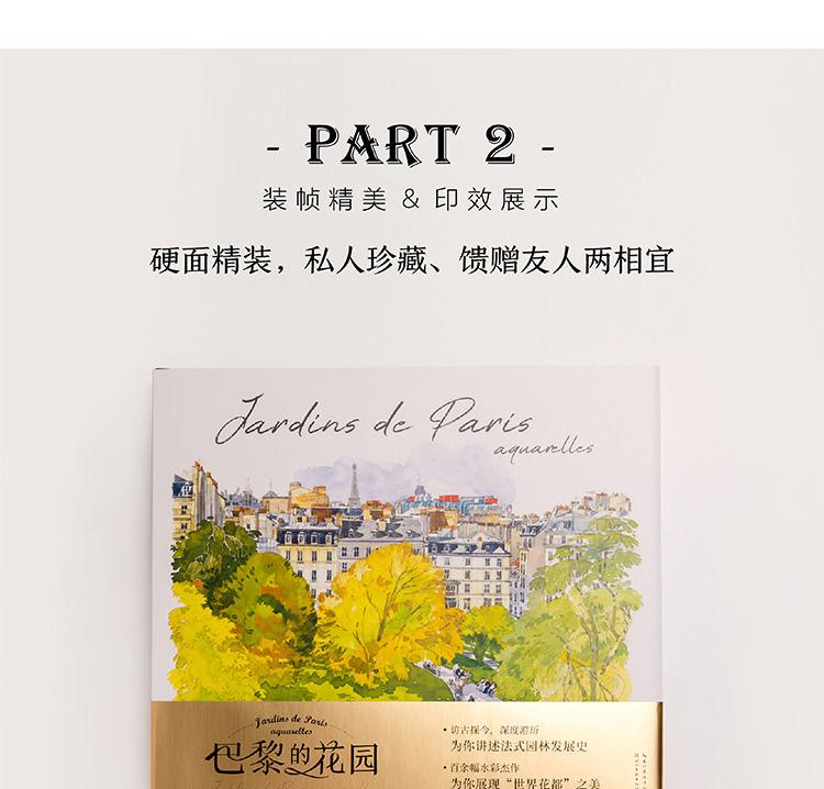 本書是一本人文主題的水彩畫集,用圖文並茂的方式為大家介紹了被譽為「世界花都」的巴黎里的各式花園,它們有的小巧迷人,有的宏大華麗;有的聲名遠播,有的鮮為人知,如:海明威去玫瑰園的盧森堡公園,巴黎的賞櫻地——蘇萊森鎮公園,世界的玫瑰堡花園,當然還有法蘭西的明珠——凡爾賽的花園……本書用百餘幅精美的水彩畫作展現了巴黎花園的四季美景;用詳細的文字講述了各式花園的設計理念、呈現特點、文化寓意以及園中種植的奇珍異草和與花園相關的歷史故事,充分展現了巴黎之木、寓意以及園中種植的奇珍。