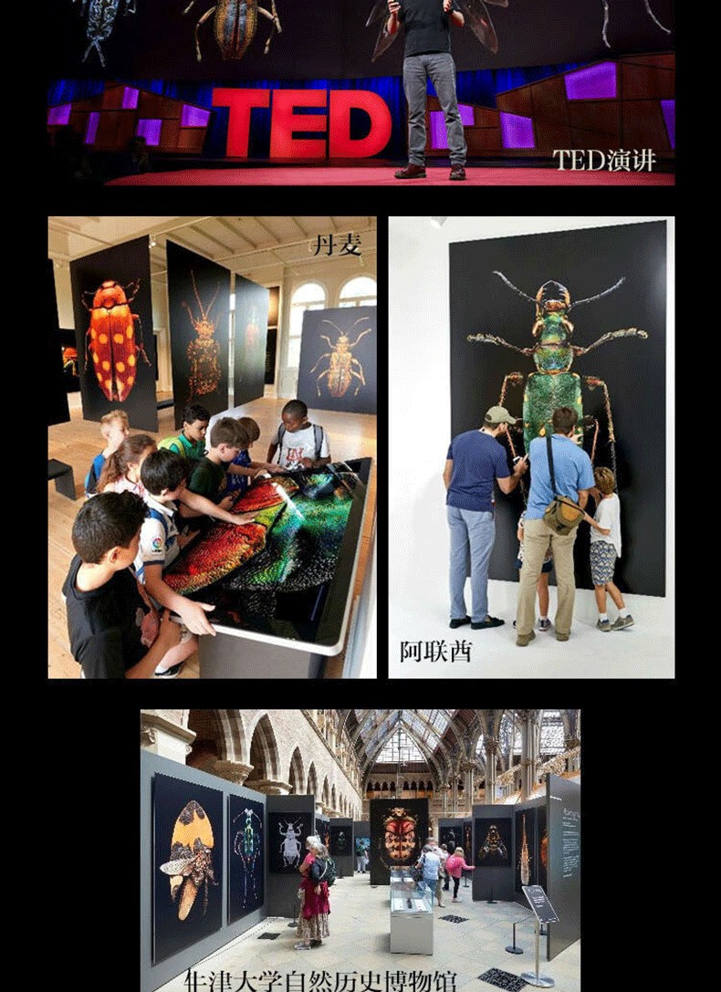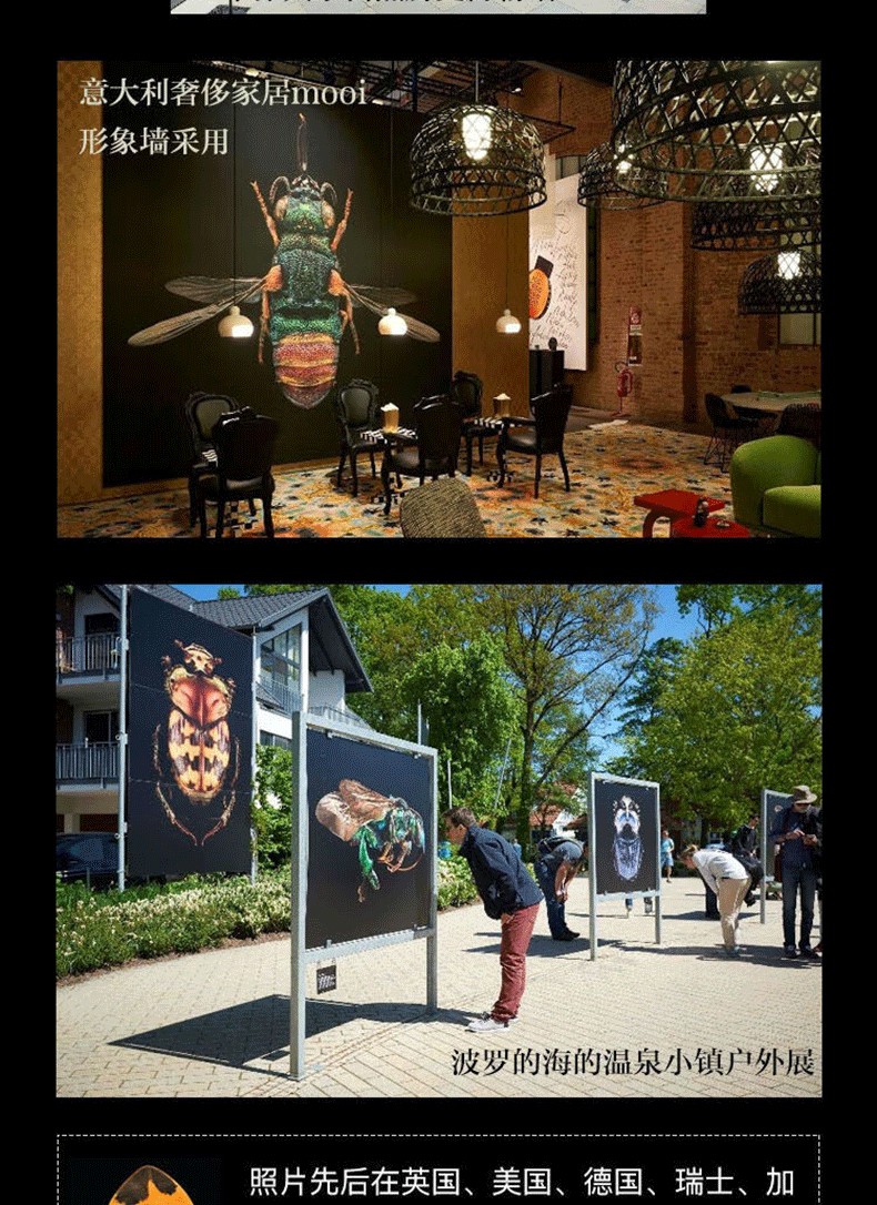 昆蟲有著驚人的複雜性,卻體型太小,讓我們無法觀察它的真正結構與形狀。借助高倍光學顯微鏡和相機鏡頭的力量,將昆蟲的微小形態展現在驚人的高分辨率下,每隻昆蟲被分成大約30個不同的部分進行拍攝,透過8000 多張獨立的局部照片,合成一隻昆蟲的完整肖像。每隻昆蟲都化身為龐然大物,色彩鮮明,脈絡清晰,纖毫畢現,創造出自然界中鮮明和生動的色彩!