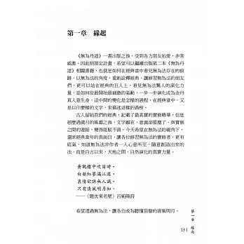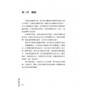 本書的誕生是應對眾多網友的要求,希望有系統化的資料以了解無為丹道,其實大道至簡,無為丹道非常簡單,但是身心非常複雜,每個人心中各有不同的挑戰要面對, 身體有不同的障礙要克服,眾多現象將至簡大道變得複雜,為了幫助各位道友了解這些不同的挑戰與障礙,才有本書的誕生。