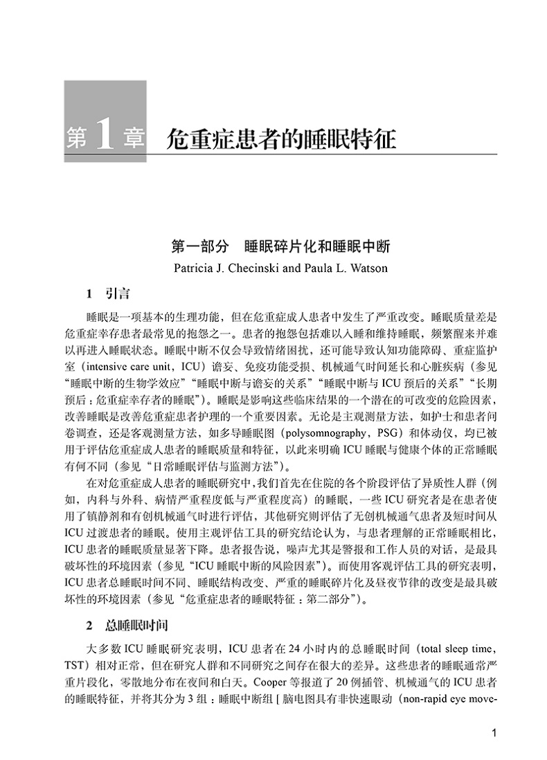 1953年,世界首個重症監護室創立於哥本哈根,由此開創了重症醫學領域的發展。 1920年代後期腦電圖的發展加速了睡眠醫學的發展。然而,直到本世紀初,睡眠發展才逐漸擴展到重症醫學領域。在過去的20年中,研究表明,睡眠障礙既是重症的合併症,也給ICU重症患者帶來不良影響,包括譫妄風險升高、對疼痛敏感性增加、術後恢復延遲、ICU住院時間延長、ICU後認知能力惡化、ICU生存率降低等。因此,如何改善ICU重症患者的睡眠障礙、改善病人預後引起ICU醫師的關注。 2018年8月,美國重症醫學會(SCCM) 次將ICU睡眠管理編入ICU 內成人病患疼痛、 躁動/鎮靜、譫妄、煞車以及睡眠中斷的管理指南(PADIS)。本書總結了當前有關危重病和康復期間睡眠相關知識,分章節討論了危重症患者睡眠特徵、非典型睡眠和病理性覺醒、正常睡眠與鎮靜期間意識改變的比較、睡眠中斷的生物學影響、ICU睡眠中斷的危險因素、常見ICU藥物對睡眠的影響、睡眠中斷及其與譫妄策略、ICU結局的關係、機械通氣和常見ICU藥物對睡眠的影響、睡眠中斷及其與譫妄等策略、ICU人群的關係、機械通氣和常見ICU藥物監測、睡眠中斷及其與譫妄等策略改善本書由睡眠醫學及重症領域的專家撰寫,包括重症監護醫師、睡眠專業醫師、護理師、醫師助理、藥劑師及呼吸治療師等。是幫助各級醫學專業技術人員對ICU重症病患睡眠生理學、睡眠評估管理、及ICU護理指導的綜合指南。