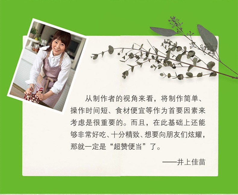 《今日便當》的作者井上佳苗是一位日本超人氣料理達人,自2005年開博客發表“便當日記”以來,每日12萬的點擊量使其成為備受追捧的料理達人。書共收錄了井上佳苗多年便當製作中具有代表性、擁有超高人氣的201款美味便當,各種食材、各種搭配、各種口味的便當製作都很好簡單,僅需10分鐘就可以完成!精美的外觀、營養的搭配、豐富的食材,每一款便當都讓人垂涎三尺,簡單的製作步驟任誰都可以輕鬆學會!