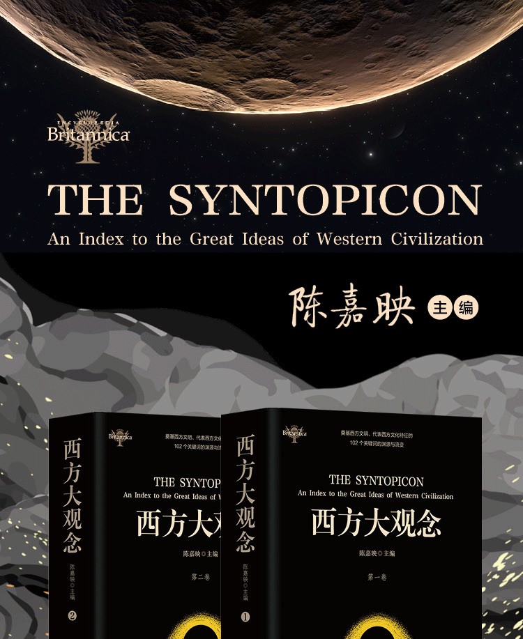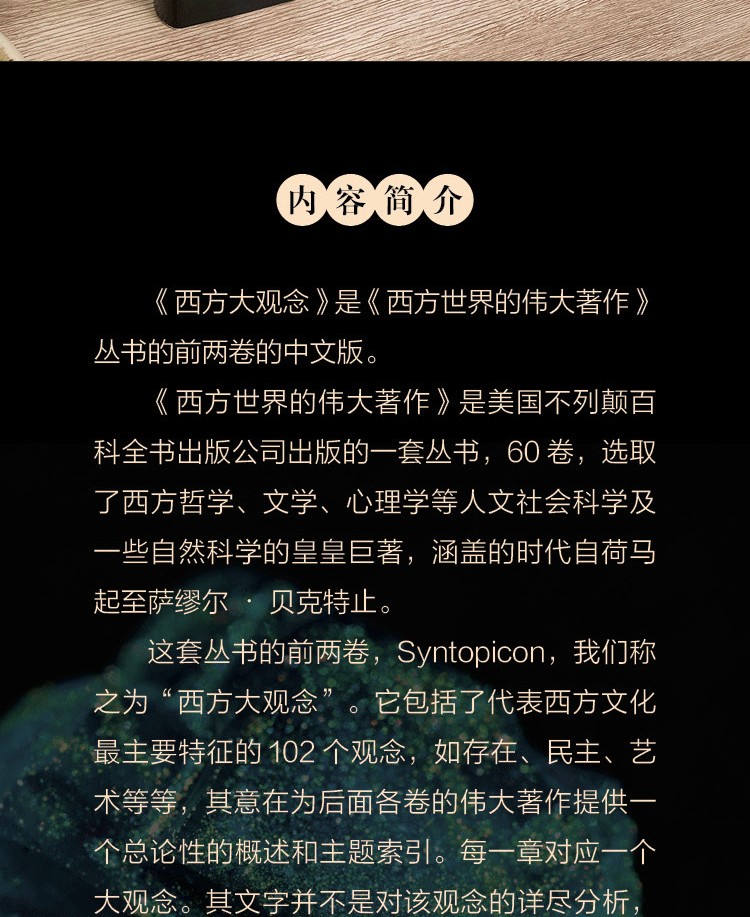 這套叢書的前兩卷,Syntopicon,我們稱之為“西方大觀念”。它包括了代表西方文化主要特徵的102個觀念,如存在、民主、藝術等等,其意在為後面各卷的偉大著作提供一個總論性的概述和主題索引。每一章對應一個大觀念。其文字並不是對該的詳盡分析,而是勾勒出該觀念的基本輪廓,引導讀者去閱讀支撐著該觀念的一批西方偉大著作。