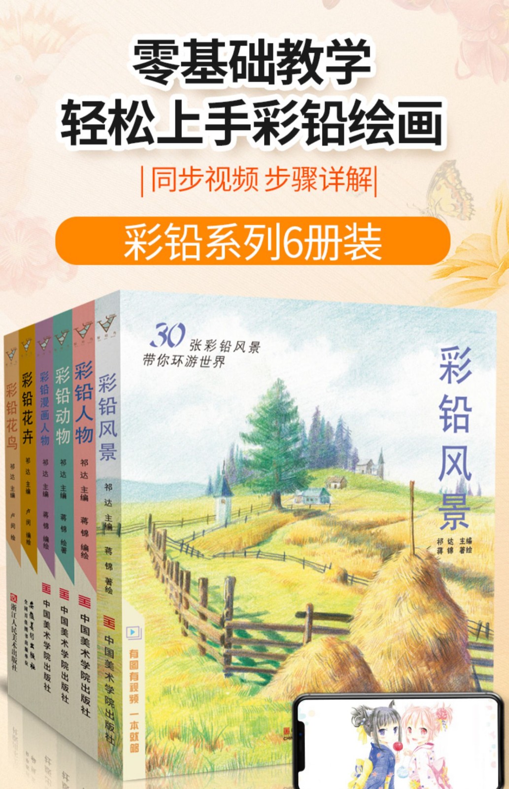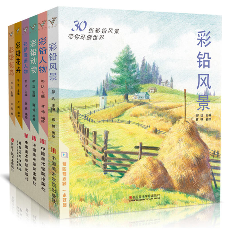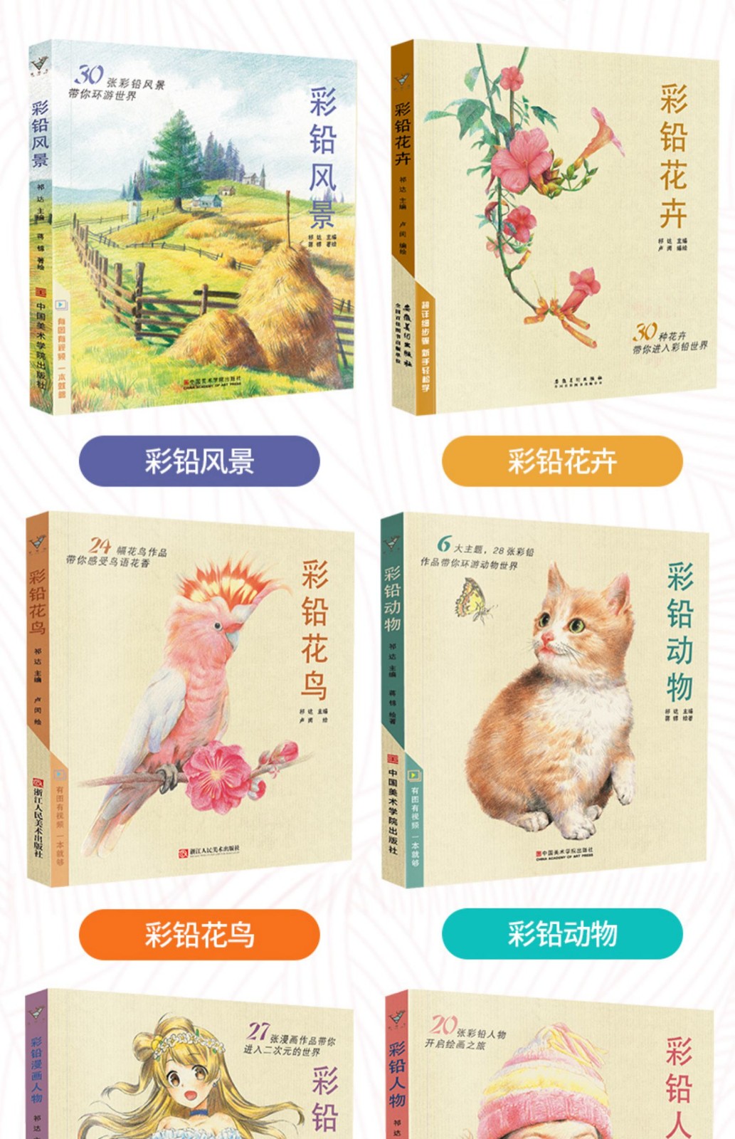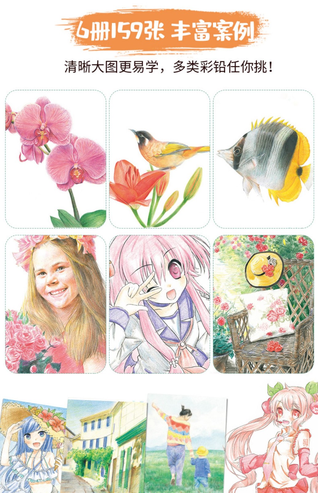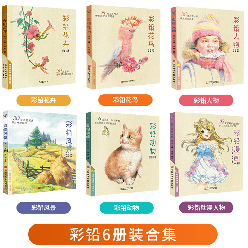 彩鉛畫合集6冊 彩色鉛筆 風景+花卉+漫畫+人物+動物+花鳥