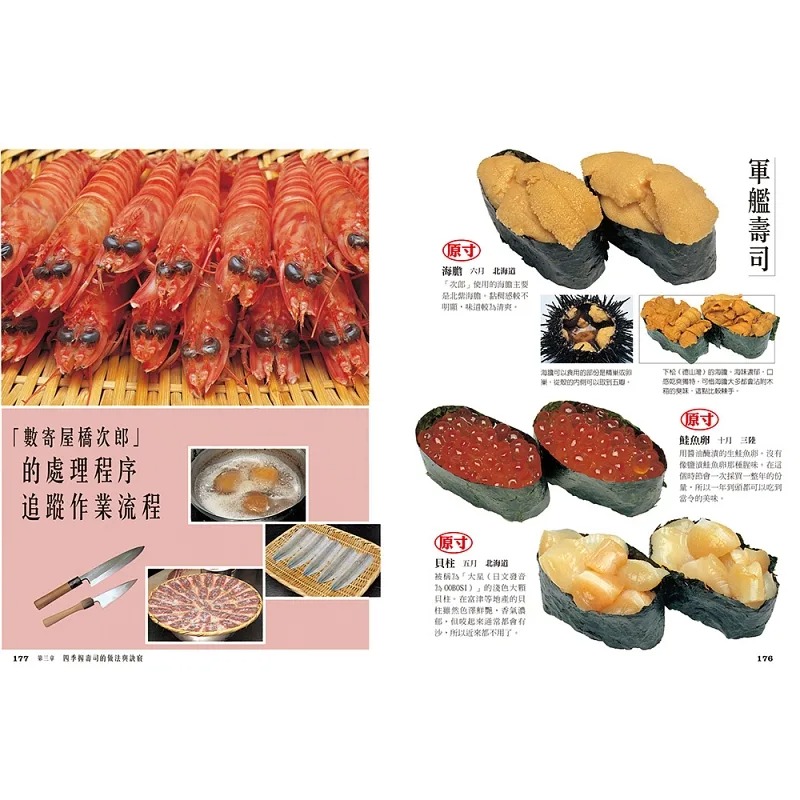 ■親手體驗日本代表和食,專業人士工具書。本書鉅細靡遺地收錄了當代第一的壽司職人小野二郎一整年間供應的所有菜單,包括握壽司、下酒菜以及小缽配菜等等,是終極版的「江戶前壽司技術指南」。瞄一下「數寄屋橋次郎」特有的原木食材盒,一看就知道裡面盡是日本近海的當令漁獲。在寒冬時節,白肉魚之王是比目魚;夏天則小鱸魚(日本關東地區的發音是FUKO,指鱸魚長約30~60cm的幼魚)和真鰈。章魚腳在冬天*是夠味,關東地區的鮑魚產季是夏天。蝦蛄雖然一年到頭在市場都買得到,但在春天帶有蝦卵的蝦蛄*是美味──。這是一本十分有用的工具書,是可以幫助您「認識當令食材的食曆」。