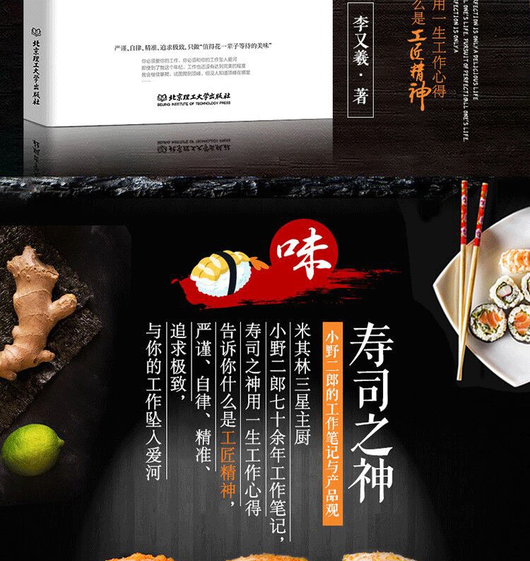 李又羲著的《壽司之神(小野二郎的工作筆記與產品觀)》是一本管理類人物傳記。本書通過描寫小野二郎的七十多年專注於製作壽司的故事,通過分享這位傳奇的米其林三星大廚在工作中的經驗與心得,展現了他對於廚藝的敬業態度。本書內容著重於小野二郎的產品觀和工作心得,多角度、多層次地介紹了一代職人的楷模,工匠精神的精髓。