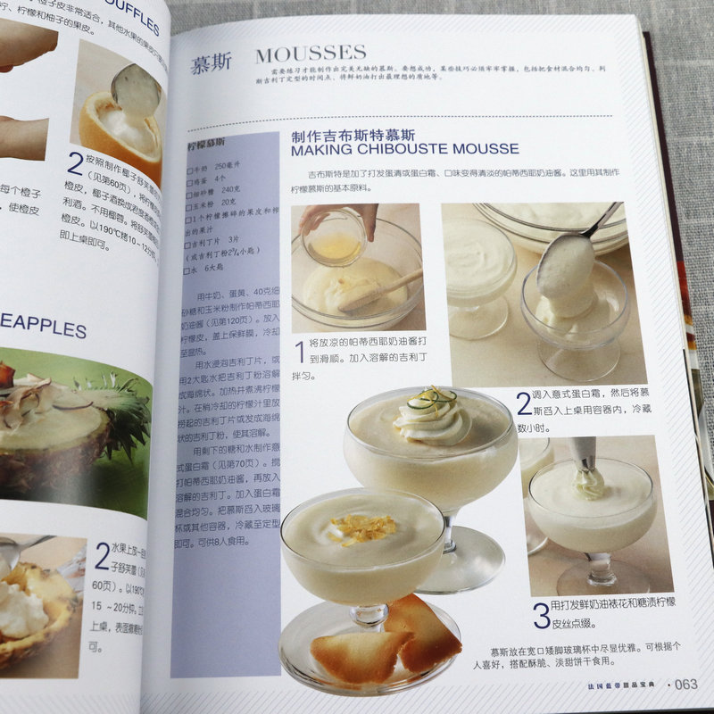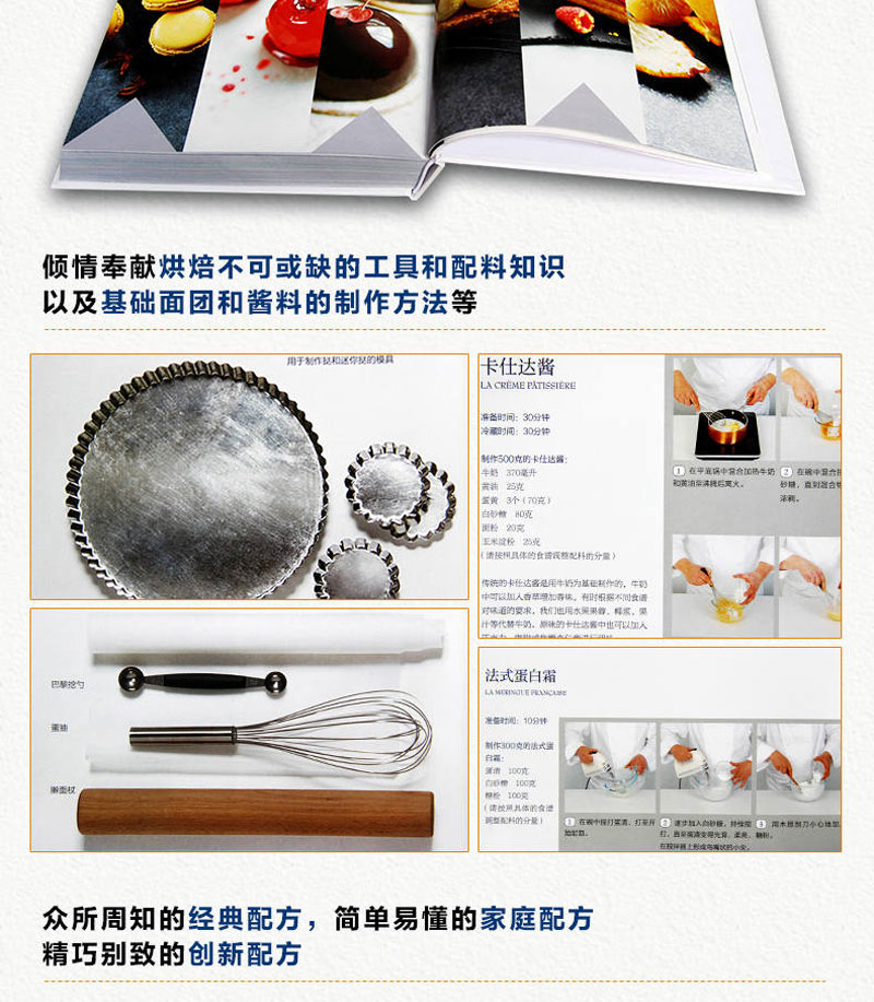 書中甜品突出法國藍帶廚藝學院特有的精緻裝飾和出眾技藝,單獨列出的參考部分則涵蓋製作麵糊、蛋白霜、沙司,以及加工水果、巧克力調溫、蛋糕裱花等所有基本技法。