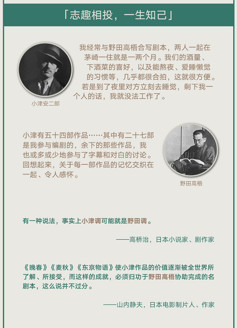 從小津安二郎的導演處女作開始,小津的電影劇本大多是與野田聯手創作的,二人一起開創了日本電影的戰後黃金時代。晚年的他們,更互為流水高山,在茅崎的旅館、蓼科山上的小屋合宿,一住就是三四個月,“志趣相投、溝通無礙”(小津語),伴隨著壽喜鍋與清酒,共同執筆了十多部載入史冊的經典作品,包括《晚春》《麥秋》《茶泡飯之味》《東京物語》《彼岸花》《秋刀魚之味》等。