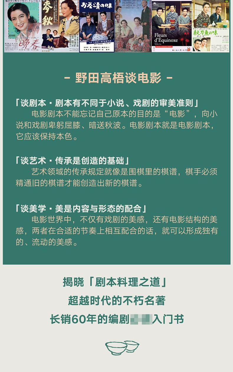 野田高梧飽覽大量經典歐美電影,也從同時代的黑澤明、川端康成、夏目漱石、谷崎潤一郎等名家處採擷靈感,將他們的創作經驗吸納到劇本這一“年輕”的形式中。他從蒙太奇手法聯想到歌舞伎的雙花道舞台,用亞里士多德《詩學》中的戲劇結構對比能劇中的“序破急”法則,從契訶夫的《備忘錄》談到夏目漱石的“味噌本”……《劇本結構論》可謂是一卷凝聚了野田高梧畢生所學的“武功秘籍”。