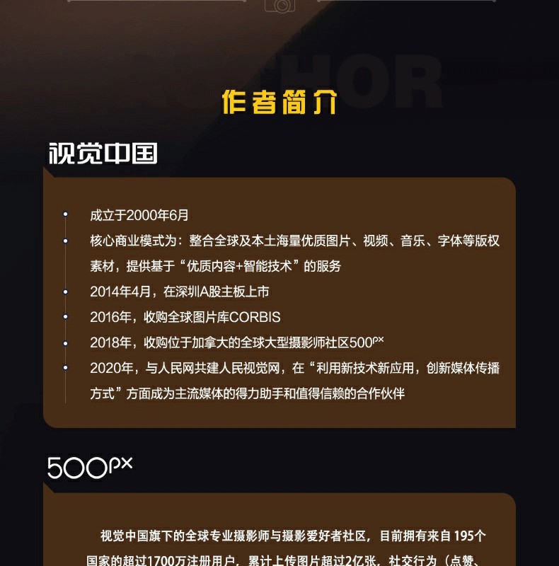視覺中國 500px是 的專業攝影師社區,聚集了來自不同 的數万位創意攝影師與上千萬攝影愛好者。 500px社區集合各方優勢資源,編著本系列教程,以期為廣大攝影愛好者提供 好的服務。