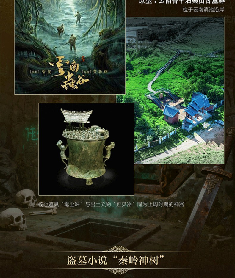 6. 溯源盜墓小說的原型與靈感來源:《盜墓筆記》中的「七星魯王宮」「秦嶺千棺鎮」的原型是哪裡?核心道具「玉俑」與「秦嶺神樹」的靈感來自哪件文物? 《鬼吹燈》中的「雲南蟲谷」與雲南晉寧石寨山古墓群之間有什麼樣的關聯?出土文物「貯貝器」就是故事中被詛咒的物證?為什麼青海都蘭熱水墓群的血渭一號墓被當地人稱為「九層妖塔」?打卡盜墓小說的故事發生地,探索迷團背後的歷史真相,讓閱讀過程充滿發現的樂趣!