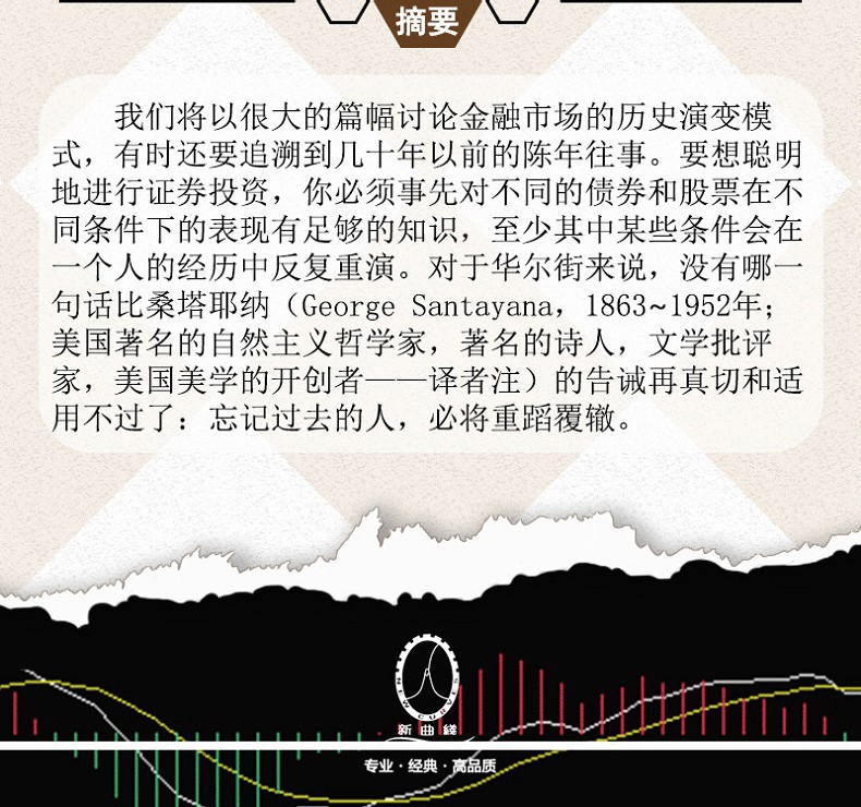 我們將以很大的篇幅討論金融市場的歷史演變模式,有時還要追溯到幾十年以前的陳年往事。要想聰明地進行證券投資,你必須事先對不同的和股票在不同條件下的表現有足夠的知識,至少其中某些條件會在一個人的經歷中反復重演。對於華爾街來說,沒有哪一句話比桑塔耶納(George Santayana,1863~1952 年;美國的自然主義哲學家,的詩人,文學批評家,美國美學的開創者——譯者註)的告誡再真切和適用不過了:“忘記過去的人,必將重蹈覆轍。”