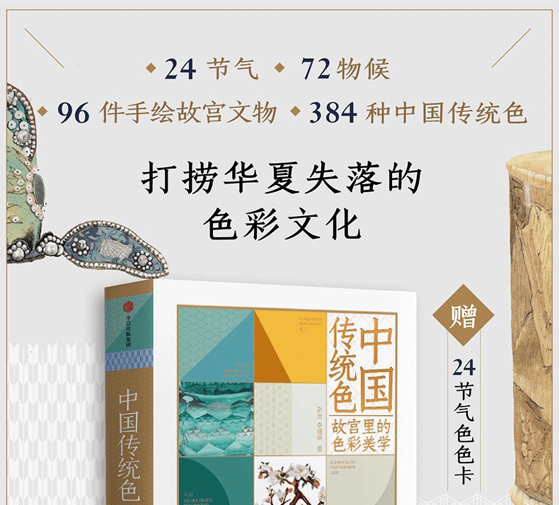 本書展現了的中國色彩文化傳承,讀之重獲中國傳統色之美。中國古代漢語中顏色詞的豐富代表了華夏文明的進化高度。豐富的顏色詞由詩詞、典籍、史書、字書、藥典、佛經等傳承至今,但散漫難尋,《中國傳統色》梳理、歸納384種中國傳統色色名,有據可查,有典可尋。又從十幾萬件故宮館藏文物中,根據24節氣72物候精選96件應時應節應色的文物,以手繪方式複原、呈現文物被磨損的色彩,提取中國傳統色色譜。
