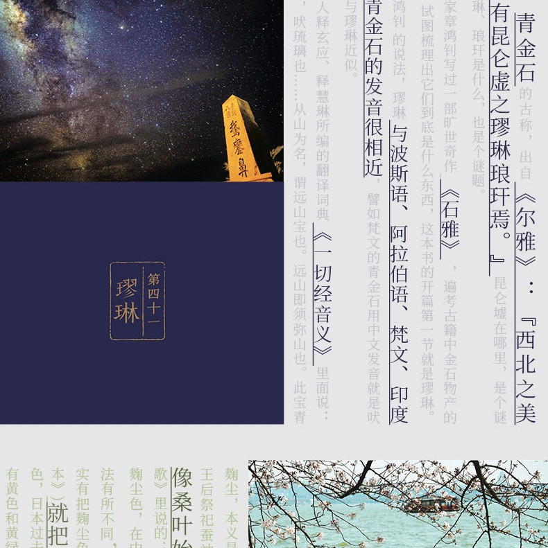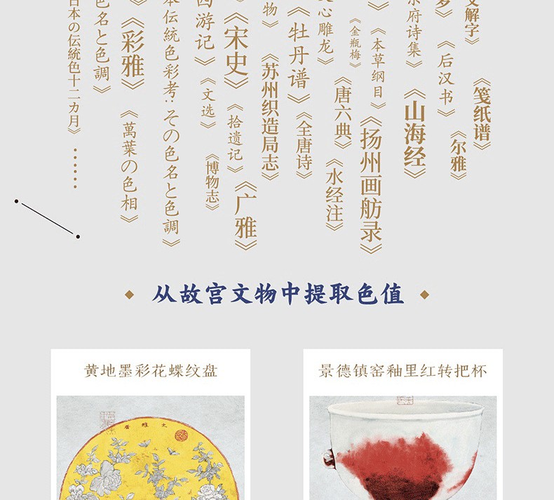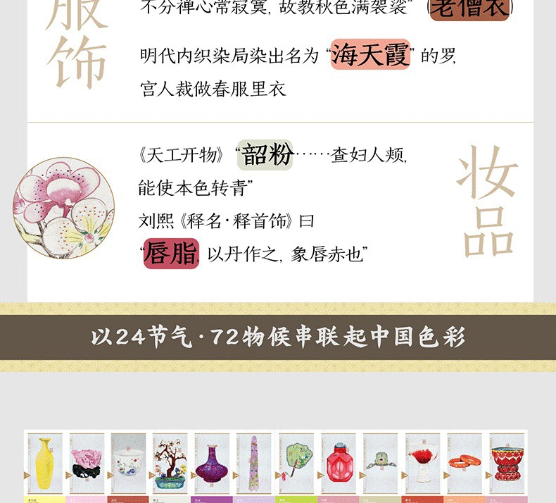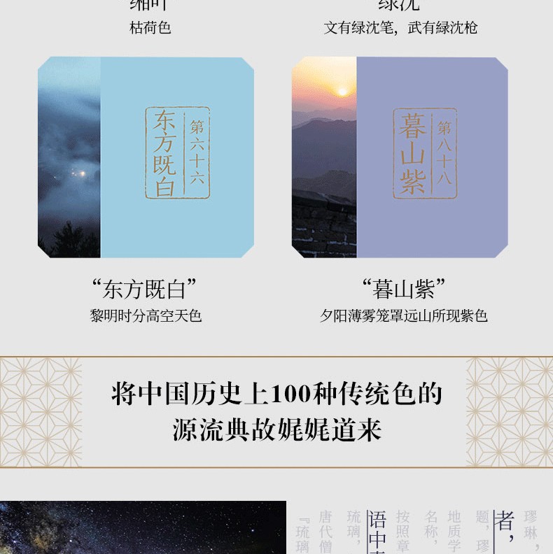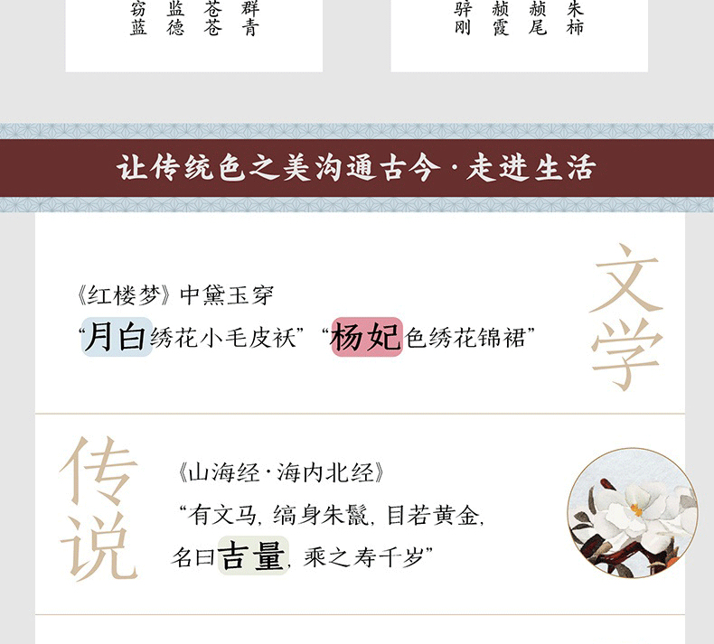 ★通過色彩感受文學作品的瑰麗。 《紅樓夢》中黛玉穿“月白繡花小毛皮襖”“楊妃色繡花錦裙”是怎樣的風姿?李白寫下“日照香爐生紫煙”時,香爐上升騰的紫煙是怎樣的虛渺?通過書中呈現的顏色,能夠得到直接的答案。影視作品中展現的色彩,也能在書中得到考證,觀影閱讀,兩相對照,更增一分樂趣,比如《延禧攻略》採用的“乾隆色譜”,確有其事:月白、官綠、水紅等色在書中都有收錄。